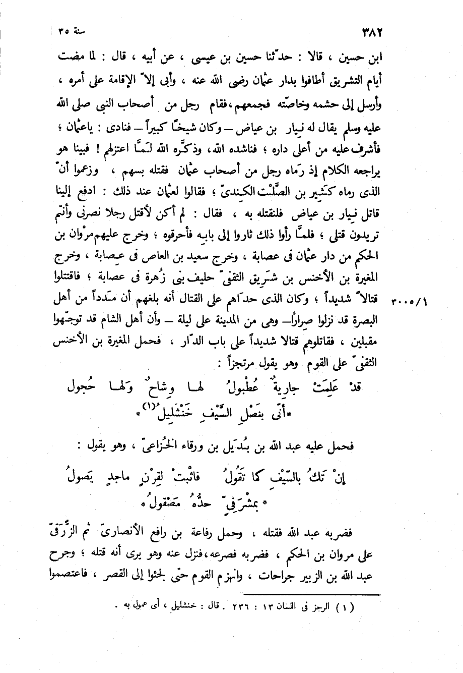 ابن حُسَيْن، قَالا: حَدَّثَنَا حُسَيْن بن عِيسَى، عَنْ أَبِيهِ، قَالَ: لما مضت أيام التشريق أطافوا بدار عُثْمَان رَضِيَ اللَّهُ عَنْهُ، وأبى إلا الإقامة عَلَى أمره، وأرسل إِلَى حشمه وخاصته فجمعهم، فقام رجل من اصحاب النبي ص يقال لَهُ نيار بن عياض- وَكَانَ شيخا كبيرا- فنادى: يَا عُثْمَانُ، فأشرف عَلَيْهِ من أعلى داره، فناشده اللَّه، وذكره اللَّه لما اعتزلهم! فبينا هُوَ يراجعه الكلام إذ رماه رجل من أَصْحَاب عُثْمَان فقتله بسهم، وزعموا أن الَّذِي رماه كثير بن الصلت الكندي، فَقَالُوا لِعُثْمَانَ عِنْدَ ذَلِكَ: ادفع إلينا قاتل نيار بن عياض فلنقتله بِهِ، فَقَالَ: لم أكن لأقتل رجلا نصرني وَأَنْتُمْ تريدون قتلي، فلما رأوا ذَلِكَ ثاروا إِلَى بابه فأحرقوه، وخرج عَلَيْهِم مَرْوَان بن الحكم من دار عُثْمَان فِي عصابة، وخرج سَعِيد بن الْعَاصِ فِي عصابة، وخرج الْمُغِيرَةُ بن الأخنس بن شريق الثقفي حليف بني زهرة فِي عصابة، فاقتتلوا قتالا شديدا، وكان الذى حداهم عَلَى القتال أنه بلغهم أن مددا من أهل الْبَصْرَةِ قَدْ نزلوا صرارا- وَهِيَ مِنَ الْمَدِينَةِ عَلَى ليلة- وأن أهل الشام قَدْ توجهوا مقبلين، فقاتلوهم قتالا شديدا عَلَى باب الدار، فحمل الْمُغِيرَةُ بن الأخنس الثقفي عَلَى القوم وَهُوَ يقول مرتجزا: