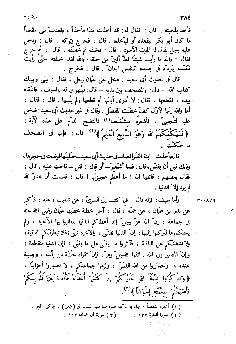 وَأَمَّا سَيْفٌ، فَإِنَّهُ قَالَ- فِيمَا كَتَبَ إِلَيَّ السَّرِيُّ، عَنْ شُعَيْبٍ، عَنْهُ: ذَكَرَ عَنْ بَدْرِ بْنِ عُثْمَانَ، عَنْ عَمِّهِ، قَالَ: آخِرُ خُطْبَةٍ خَطَبَهَا عُثْمَانُ رَضِيَ اللَّهُ عَنْهُ فِي جَمَاعَةٍ: إِنَّ اللَّهَ عَزَّ وَجَلَّ إِنَّمَا أَعْطَاكُمُ الدُّنْيَا لِتَطْلُبُوا بِهَا الآخِرَةَ، وَلَمْ يُعْطِكُمُوهَا لِتَرْكَنُوا إِلَيْهَا، إِنَّ الدُّنْيَا تفنى، والآخرة تبقى، فلا تبطرنكم الفانية، ولا تَشْغَلَنَّكُمْ عَنِ الْبَاقِيَةِ، فَآثِرُوا مَا يَبْقَى عَلَى مَا يَفْنَى، فَإِنَّ الدُّنْيَا مُنْقَطِعَةٌ، وَإِنَّ الْمَصِيرَ إِلَى اللَّهِ اتَّقُوا اللَّهَ جَلَّ وَعَزَّ، فَإِنَّ تَقْوَاهُ جُنَّةٌ مِنْ بَأْسِهِ، وَوَسِيلَةٌ عِنْدَهُ، وَاحْذَرُوا مِنَ اللَّهِ الْغِيَرَ، وَالْزَمُوا جَمَاعَتَكُمْ، لا تَصِيرُوا أَحْزَابًا، «وَاذْكُرُوا نِعْمَتَ اللَّهِ عَلَيْكُمْ إِذْ كُنْتُمْ أَعْداءً فَأَلَّفَ بَيْنَ قُلُوبِكُمْ فَأَصْبَحْتُمْ بِنِعْمَتِهِ إِخْواناً»