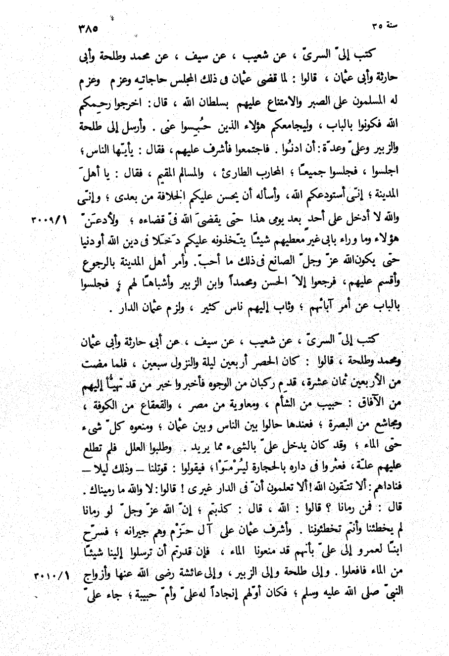 كتب إلي السري، عن شعيب، عن سيف، عن محمد وطلحة وأبي حارثة وأبي عثمان، قَالُوا: لَمَّا قَضَى عُثْمَانُ فِي ذَلِكَ الْمَجْلِسِ حاجاته وعزم وَعَزَمَ لَهُ الْمُسْلِمُونَ عَلَى الصَّبْرِ وَالامْتِنَاعِ عَلَيْهِمْ بِسُلْطَانِ اللَّهِ، قَالَ: اخْرُجُوا رَحِمَكُمُ اللَّهُ فَكُونُوا بِالْبَابِ، وَلْيُجَامِعْكُمْ هَؤُلاءِ الَّذِينَ حُبِسُوا عَنِّي وَأَرْسَلَ إِلَى طَلْحَةَ وَالزُّبَيْرِ وَعَلِيٍّ وَعِدَّةٍ: أَنِ ادْنُوا فاجتمعوا فأشرف عليهم، فقال: يا ايها النَّاسُ، اجْلِسُوا، فَجَلَسُوا جَمِيعًا، الْمُحَارِبُ الطَّارِئُ، وَالْمُسَالِمُ الْمُقِيمُ، فَقَالَ: يَا أَهْلَ الْمَدِينَةِ، إِنِّي أَسْتَوْدِعُكُمُ اللَّهَ، وَأَسْأَلُهُ أَنْ يُحْسِنَ عَلَيْكُمُ الْخِلافَةَ مِنْ بعدي، وانى وَاللَّهِ لا أَدْخُلُ عَلَى أَحَدٍ بَعْدَ يَوْمِي هَذَا حَتَّى يَقْضِيَ اللَّهُ فِيَّ قَضَاءَهُ، وَلأَدَعَنَّ هَؤُلاءِ وَمَا وَرَاءَ بَابِي غَيْرَ مُعْطِيهِمْ شَيْئًا يَتَّخِذُونَهُ عَلَيْكُمْ دَخَلا فِي دِينِ اللَّهِ أَوْ دُنْيَا حَتَّى يَكُونَ اللَّهُ عَزَّ وَجَلَّ الصَّانِعَ فِي ذَلِكَ مَا أَحَبَّ وَأَمَرَ أَهْلَ الْمَدِينَةِ بِالرُّجُوعِ وَأَقْسَمَ عَلَيْهِمْ، فَرَجَعُوا إِلا الْحَسَنَ وَمُحَمَّدًا وَابْنَ الزُّبَيْرِ وَأَشْبَاهًا لَهُمْ، فَجَلَسُوا بِالْبَابِ عَنْ أَمْرِ آبَائِهِمْ، وَثَابَ إِلَيْهِمْ نَاسٌ كَثِيرٌ، وَلَزِمَ عُثْمَانُ الدَّارَ كَتَبَ إِلَيَّ السَّرِيُّ، عَنْ شُعَيْبٍ، عن سيف، عن أبي حارثة وأبي عثمان ومحمد وَطَلْحَة، قَالُوا: كَانَ الحصر أربعين ليلة والنزول سبعين، فلما مضت من الأربعين ثمان عشرة، قدم ركبان من الوجوه فأخبروا خبر من قَدْ تهيأ إِلَيْهِم من الآفاق: حبيب من الشام، ومعاوية من مصر، والقعقاع من الْكُوفَة، ومجاشع مِنَ الْبَصْرَةِ، فعندها حالوا بين الناس وبين عُثْمَان، ومنعوه كل شَيْء حَتَّى الماء، وَقَدْ كَانَ يدخل علي بالشيء مما يريد وطلبوا العلل فلم تطلع عَلَيْهِم علة، فعثروا فِي داره بالحجارة ليرموا، فيقولوا: قوتلنا- وَذَلِكَ ليلا- فناداهم: أَلا تتقون اللَّه! أَلا تعلمون أن فِي الدار غيري! قَالُوا: لا وَاللَّهِ مَا رميناك.