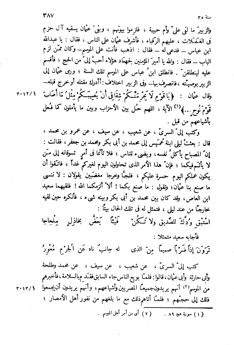 كَتَبَ إِلَيَّ السري، عن شعيب، عن سيف، عن محمد وَطَلْحَةَ وَأَبِي حَارِثَةَ وَأَبِي عُثْمَانَ، قَالُوا: فَلَمَّا بُويِعَ النَّاسُ جَاءَ السَّابِقُ فَقَدِمَ بِالسَّلامَةِ، فَأَخْبَرَهُمْ مِنَ الْمَوْسِمِ أَنَّهُمْ يُرِيدُونَ جَمِيعًا الْمِصْرِيِّينَ وَأَشْيَاعَهُمْ، وَأَنَّهُمْ يُرِيدُونَ أَنْ يَجْمَعُوا ذَلِكَ إِلَى حَجِّهِمْ، فَلَمَّا أَتَاهُمْ ذَلِكَ مَعَ مَا بَلَغَهُمْ مِنْ نُفُورِ أَهْلِ الأَمْصَارِ،