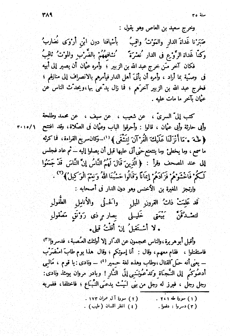 كَتَبَ إِلَيَّ السَّرِيُّ، عَنْ شُعَيْبٍ، عَنْ سيف، عن محمد وطلحة وأبي حارثة وأبي عُثْمَانَ، قَالُوا: وَأَحْرَقُوا الْبَابَ وَعُثْمَانُ فِي الصَّلاةِ، وقد افتتح «طه. ما أَنْزَلْنا عَلَيْكَ الْقُرْآنَ لِتَشْقى» - وَكَانَ سَرِيعَ الْقِرَاءَةِ، فَمَا كَرَثَهُ مَا سَمِعَ، وَمَا يُخْطِئُ وَمَا يَتَتَعْتَعُ حَتَّى أَتَى عَلَيْهَا قَبْلَ أَنْ يَصِلُوا إِلَيْهِ- ثُمَّ عَادَ فَجَلَسَ إِلَى عِنْدِ الْمُصْحَفِ وَقَرَأَ: «الَّذِينَ قالَ لَهُمُ النَّاسُ إِنَّ النَّاسَ قَدْ جَمَعُوا لَكُمْ فَاخْشَوْهُمْ فَزادَهُمْ إِيماناً وَقالُوا حَسْبُنَا اللَّهُ وَنِعْمَ الْوَكِيلُ» .