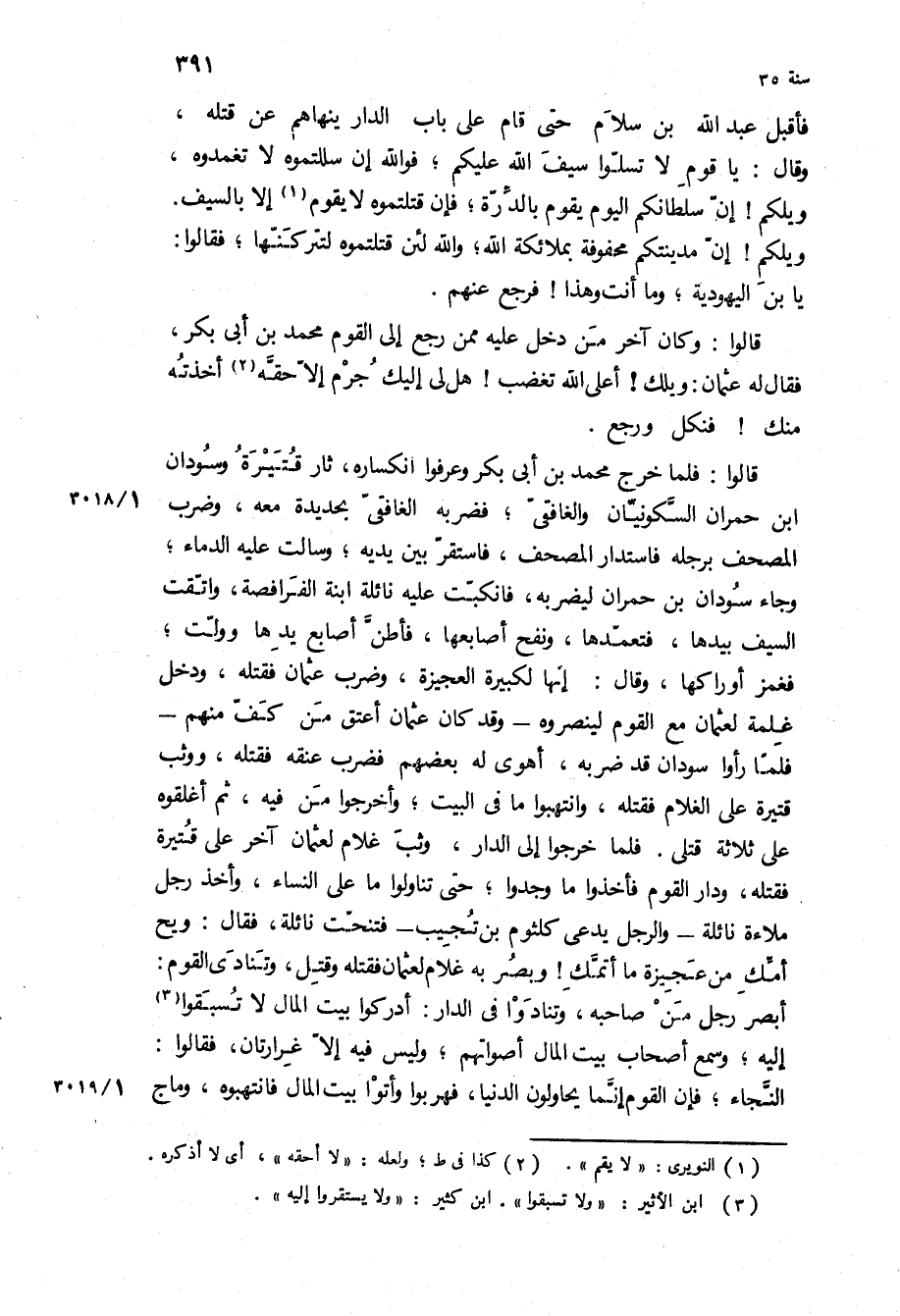 قَالُوا: فَلَمَّا خَرَجَ مُحَمَّدُ بْنُ أَبِي بَكْرٍ وَعَرَفُوا انْكِسَارَهُ، ثَارَ قتيرة وسودان ابن حُمْرَانَ السَّكُونِيَّانِ وَالْغَافِقِيُّ، فَضَرَبَهُ الْغَافِقِيُّ بِحَدِيدَةٍ مَعَهُ، وَضَرَبَ الْمُصْحَفَ بِرِجْلِهِ فَاسْتَدَارَ الْمُصْحَفُ، فَاسْتَقَرَّ بَيْنَ يَدَيْهِ، وَسَالَتْ عَلَيْهِ الدِّمَاءُ، وَجَاءَ سُودَانُ بْنُ حُمْرَانَ لِيَضْرِبَهُ، فَانْكَبَّتْ عَلَيْهِ نَائِلَةُ ابْنَةُ الْفُرَافِصَةِ، وَاتَّقَتِ السَّيْفَ بِيَدِهَا، فَتَعَمَّدَهَا، وَنَفَحَ أَصَابِعَهَا، فَأَطَنَّ أَصَابِعَ يَدِهَا وَوَلَّتْ، فَغَمَزَ أَوْرَاكَهَا، وَقَالَ: إِنَّهَا لَكَبِيرَةُ الْعَجِيزَةِ، وَضَرَبَ عُثْمَانَ فَقَتَلَهُ، وَدَخَلَ غُلْمَةٌ لِعُثْمَانَ مَعَ الْقَوْمِ لِيَنْصُرُوهُ- وَقَدْ كَانَ عُثْمَانُ أَعْتَقَ مَنْ كَفَّ مِنْهُمْ- فَلَمَّا رَأَوْا سُودَانَ قَدْ ضَرَبَهُ، أَهْوَى لَهُ بَعْضُهُمْ فَضَرَبَ عُنُقَهُ فَقَتَلَهُ، وَوَثَبَ قُتَيْرَةُ عَلَى الْغُلامِ فَقَتَلَهُ، وَانْتَهَبُوا مَا فِي الْبَيْتِ، وَأَخْرَجُوا مَنْ فِيهِ، ثُمَّ أَغْلَقُوهُ عَلَى ثَلاثَةِ قَتْلَى فَلَمَّا خَرَجُوا إِلَى الدَّارِ، وَثَبَ غُلامٌ لِعُثْمَانَ آخَرُ عَلَى قُتَيْرَةَ فَقَتَلَهُ، وَدَارَ الْقَوْمُ فَأَخَذُوا مَا وَجَدُوا، حَتَّى تَنَاوَلُوا مَا عَلَى النِّسَاءِ، وَأَخَذَ رَجُلٌ مُلاءَةَ نَائِلَةَ- وَالرَّجُلُ يُدْعَى كُلْثُومَ بْنَ تُجِيبَ- فَتَنَحَّتْ نَائِلَةُ، فَقَالَ: وَيْحَ أُمُّكِ مِنْ عَجِيزَةٍ مَا اتمك! وَبَصَرَ بِهِ غُلامٌ لِعُثْمَانَ فَقَتَلَهُ وَقُتِلَ، وَتَنَادَى الْقَوْمُ: