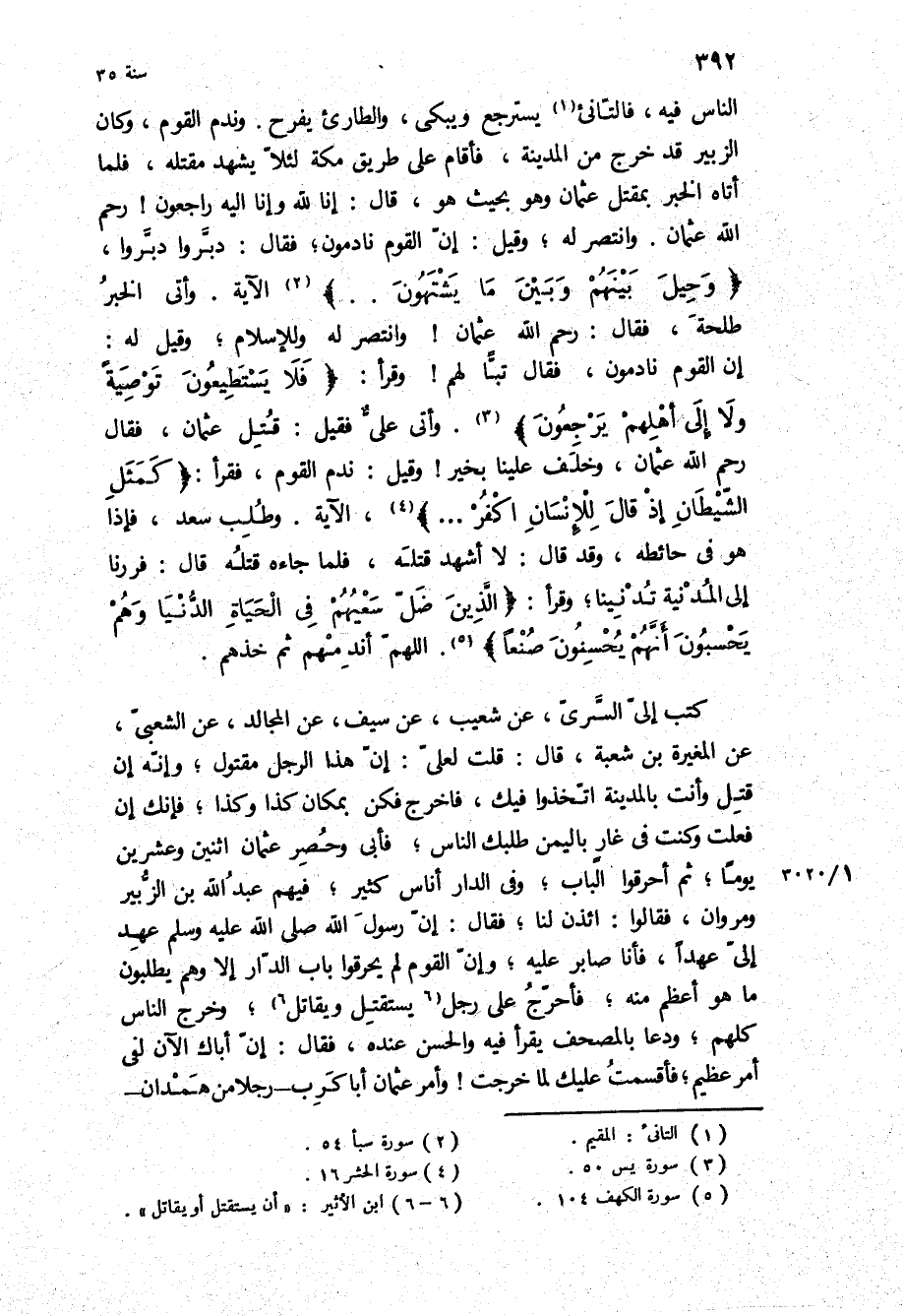 كَتَبَ إِلَيَّ السَّرِيُّ، عَنْ شُعَيْبٍ، عَنْ سَيْفٍ، عَنِ الْمُجَالِدِ، عَنِ الشَّعْبِيِّ، عَنِ الْمُغِيرَةِ بْنِ شُعْبَةَ، قَالَ: قُلْتُ لِعَلِيٍّ: إِنَّ هَذَا الرَّجُلَ مَقْتُولٌ، وَإِنَّهُ إِنْ قُتِلَ وَأَنْتَ بِالْمَدِينَةِ اتَّخَذُوا فِيكَ، فَاخْرُجْ فَكُنْ بِمَكَانِ كَذَا وَكَذَا، فَإِنَّكَ إِنْ فَعَلْتَ وَكُنْتَ فِي غَارٍ بِالْيَمَنِ طَلَبَكَ النَّاسُ، فَأَبَى وَحُصِرَ عثمان اثنين وَعِشْرِينَ يَوْمًا، ثُمَّ أَحْرَقُوا الْبَابَ، وَفِي الدَّارِ أُنَاسٌ كَثِيرٌ، فِيهِمْ عَبْدُ اللَّهِ بْنُ الزُّبَيْرِ وَمَرْوَانُ، فَقَالُوا: ائْذَنْ لَنَا، فَقَالَ: إِنَّ رَسُولَ الله ص عَهِدَ إِلَيَّ عَهْدًا، فَأَنَا صَابِرٌ عَلَيْهِ، وَإِنَّ الْقَوْمَ لَمْ يَحْرِقُوا بَابَ الدَّارِ إِلا وَهُمْ يَطْلُبُونَ مَا هُوَ أَعْظَمَ مِنْهُ، فَأُحَرِّجُ عَلَى رجل يستقتل وَيُقَاتِلُ، وَخَرَجَ النَّاسُ كُلُّهُمْ، وَدَعَا بِالْمُصْحَفِ يَقْرَأُ فِيهِ وَالْحَسَنُ عِنْدَهُ، فَقَالَ: إِنَّ أَبَاكَ الآنَ لَفِي أَمْرٍ عَظِيمٍ، فَأَقْسَمْتُ عَلَيْكَ لَمَا خَرَجْتَ! وَأَمَرَ عُثْمَانُ أَبَا كَرِبٍ- رَجُلا مِنْ هَمْدَانَ-