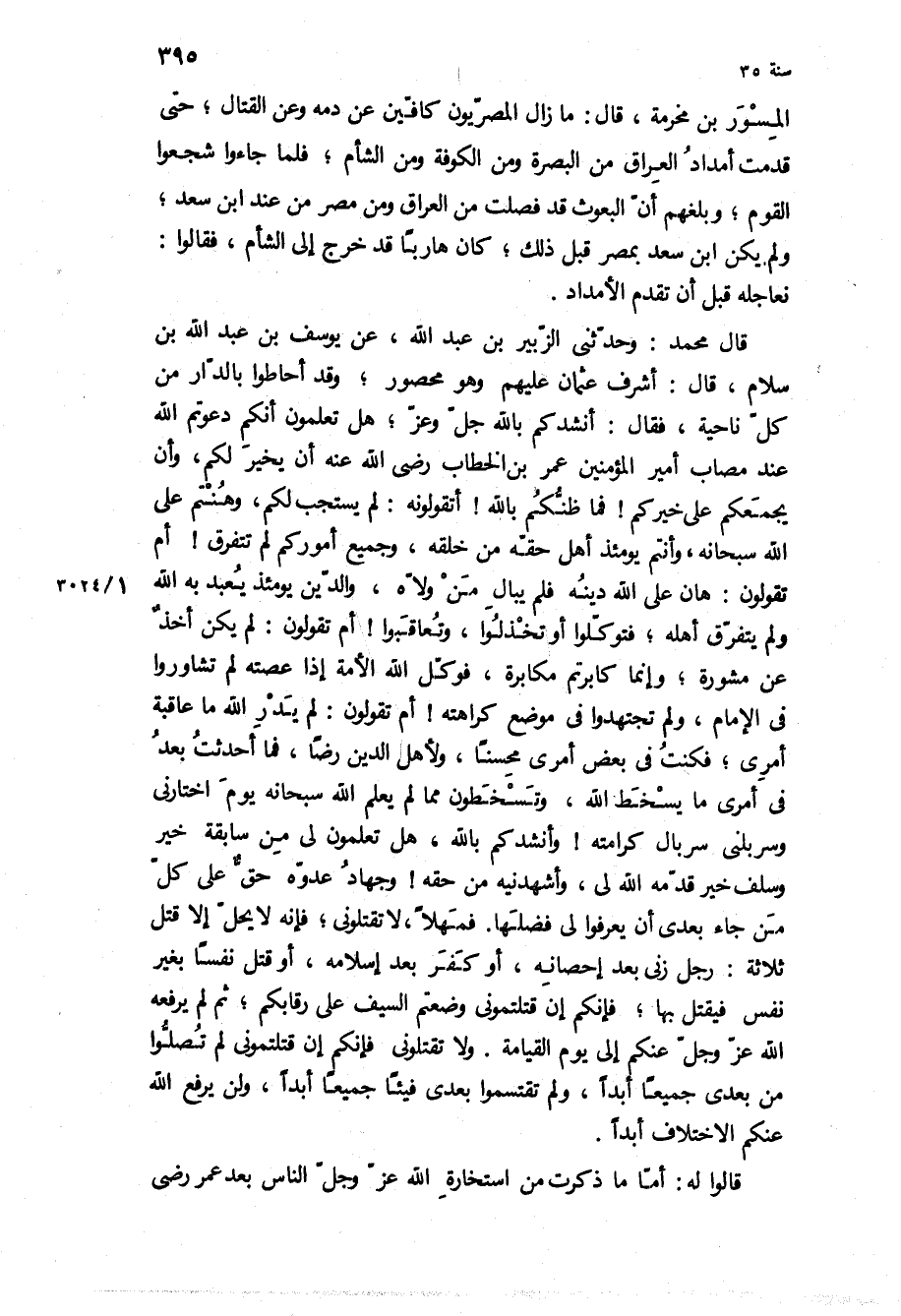 نعاجله قبل أن تقدم الأمداد قَالَ مُحَمَّدٌ: وَحَدَّثَنِي الزُّبَيْرُ بْنُ عَبْدِ اللَّهِ، عَنْ يُوسُفَ بْنِ عَبْدِ اللَّهِ بْنِ سَلامٍ، قَالَ: أَشْرَفَ عُثْمَانُ عَلَيْهِمْ وَهُوَ مَحْصُورٌ، وَقَدْ أَحَاطُوا بِالدَّارِ مِنْ كُلِّ نَاحِيَةٍ، فَقَالَ: أَنْشُدُكُمْ بِاللَّهِ جَلَّ وَعَزَّ، هَلْ تَعْلَمُونَ أَنَّكُمْ دَعَوْتُمُ اللَّهَ عِنْدَ مُصَابِ أَمِيرِ الْمُؤْمِنِينَ عُمَرَ بْنِ الْخَطَّابِ رَضِيَ اللَّهُ عَنْهُ أَنْ يُخَيِّرَ لَكُمْ، وَأَنْ يَجْمَعَكُمْ عَلَى خَيْرِكُمْ! فَمَا ظَنُّكُمْ بِاللَّهِ! أَتَقُولُونَهُ: لَمْ يَسْتَجِبْ لَكُمْ، وَهُنْتُمْ عَلَى اللَّهِ سُبْحَانَهُ، وَأَنْتُمْ يَوْمَئِذٍ أَهْلُ حَقِّهِ مِنْ خَلْقِهِ، وَجَمِيعُ أُمُورِكُمْ لَمْ تَتَفَرَّقْ! أَمْ تَقُولُونَ: هَانَ عَلَى اللَّهِ دِينُهُ فَلَمْ يُبَالِ مَنْ وَلاهُ، وَالدِّينُ يَوْمَئِذٍ يُعْبَدُ بِهِ اللَّهُ وَلَمْ يَتَفَرَّقْ أَهْلُهُ، فَتَوَكَّلُوا أَوْ تُخْذَلُوا، وَتُعَاقَبُوا! أَمْ تَقُولُونَ: لَمْ يَكُنْ أُخِذَ عَنْ مَشُورَةٍ، وَإِنَّمَا كَابَرْتُمْ مُكَابَرَةً، فَوَكَّلَ اللَّهُ الأُمَّةَ إِذَا عَصَتْهُ لَمْ تُشَاوِرُوا فِي الإِمَامِ، وَلَمْ تَجْتَهِدُوا فِي مَوْضِعِ كَرَاهَتِهِ! أَمْ تَقُولُونَ: لَمْ يَدْرِ اللَّهُ مَا عَاقِبَةُ أَمْرِي، فَكُنْتُ فِي بَعْضِ أَمْرِي مُحْسِنًا، وَلأَهْلِ الدِّينِ رِضًا، فَمَا أَحْدَثْتُ بَعْدُ فِي أَمْرِي مَا يُسْخِطُ اللَّهَ، وَتَسْخَطُونَ مِمَّا لَمْ يَعْلِمِ اللَّهُ سُبْحَانَهُ يَوْمَ اخْتَارَنِي وَسَرْبَلَنِي سِرْبَالَ كَرَامَتِهِ! وَأَنْشُدُكُمْ بِاللَّهِ، هَلْ تَعْلَمُونَ لِي مِنْ سَابِقَةِ خَيْرٍ وَسَلَفِ خَيْرٍ قَدَّمَهُ اللَّهُ لِي، وَأَشْهَدَنِيهِ مِنْ حَقِّهِ! وَجِهَادِ عَدُوِّهِ حَقٌّ عَلَى كُلِّ مَنْ جَاءَ بَعْدِي أَنْ يَعْرِفُوا لِي فَضْلَهَا فَمَهْلا، لا تَقْتُلُونِي، فَإِنَّهُ لا يَحِلُّ إِلا قَتْلُ ثَلاثَةٍ: رَجُلٍ زَنَى بَعْدَ إِحْصَانِهِ، أَوْ كَفَرَ بَعْدَ إِسْلامِهِ، أَوْ قَتَلَ نَفْسًا بِغَيْرِ نَفْسٍ فَيُقْتَلُ بِهَا، فَإِنَّكُمْ إِنْ قَتَلْتُمُونِي وَضَعْتُمُ السَّيْفَ عَلَى رِقَابِكُمْ، ثُمَّ لَمْ يَرْفَعْهُ اللَّهُ عَزَّ وَجَلَّ عَنْكُمْ إِلَى يَوْمِ الْقِيَامَةِ وَلا تَقْتُلُونِي فَإِنَّكُمْ إِنْ قَتَلْتُمُونِي لَمْ تصلوا مِنْ بَعْدِي جَمِيعًا أَبَدًا، وَلَمْ تَقْتَسِمُوا بَعْدِي فَيْئًا جَمِيعًا أَبَدًا، وَلَنْ يَرْفَعَ اللَّهُ عَنْكُمُ الاخْتِلافَ أَبَدًا.