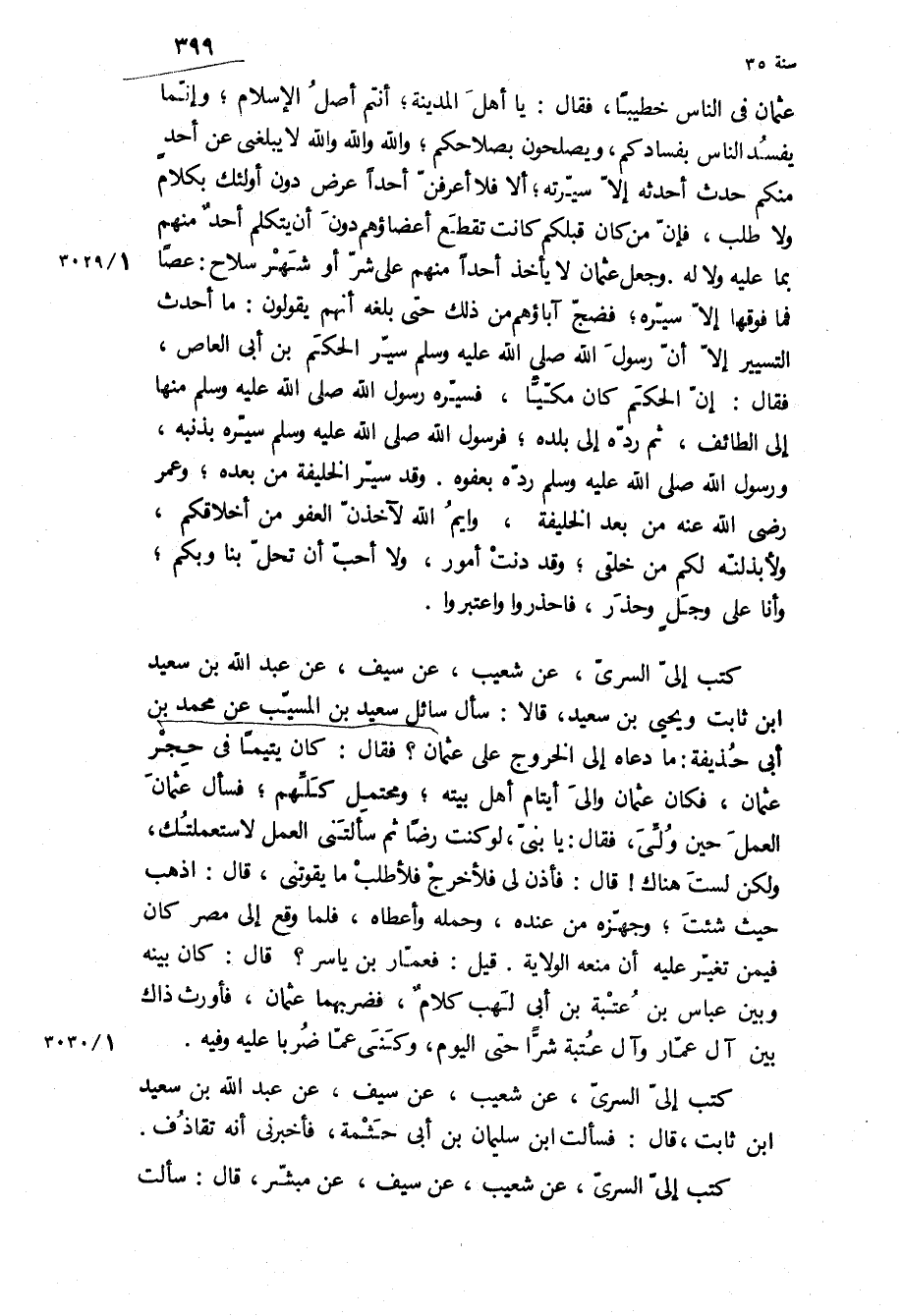 عُثْمَان فِي الناس خطيبا، فَقَالَ: يَا أهل الْمَدِينَةِ، أنتم أصل الإِسْلام، وإنما يفسد الناس بفسادكم، ويصلحون بصلاحكم، وَاللَّهِ وَاللَّهِ وَاللَّهِ لا يبلغني عن أحد مِنْكم حدث أحدثه إلا سيرته، أَلا فلا أعرفن أحدا عرض دون أُولَئِكَ بكلام وَلا طلب، فإن من كَانَ قبلكم كَانَتْ تقطع أعضاؤهم دون أن يتكلم أحد مِنْهُمْ بِمَا عَلَيْهِ وَلا لَهُ وجعل عُثْمَان لا يأخذ أحدا مِنْهُمْ عَلَى شر أو شهر سلاح: عصا فما فوقها إلا سيره، فضج آباؤهم من ذَلِكَ حَتَّى بلغه أَنَّهُمْ يقولون: مَا أحدث التسيير إلا أَنَّ رسول الله ص سير الحكم بن أبي العاص، فَقَالَ: إن الحكم كان مكيا، فسيره رسول الله ص منها إِلَى الطائف، ثُمَّ رده إِلَى بلده، فرسول الله ص سيره بذنبه، ورسول الله ص رده بعفوه وَقَدْ سير الخليفة من بعده، وعمر رَضِيَ اللَّهُ عَنْهُ من بعد الخليفة، وايم اللَّه لأخذن العفو من أخلاقكم، ولأبذلنه لكم من خلقي، وَقَدْ دنت أمور، وَلا أحب أن تحل بنا وبكم، وأنا عَلَى وجل وحذر، فاحذروا واعتبروا كَتَبَ إِلَيَّ السَّرِيُّ، عن شعيب، عن سيف، عن عبد الله بن سعيد ابن ثَابِت ويحيى بن سَعِيدٍ، قَالا: سأل سائل سَعِيد بْنُ الْمُسَيِّبِ عن مُحَمَّد بن أبي حُذَيْفَة: مَا دعاه إِلَى الخروج عَلَى عُثْمَانَ؟ فَقَالَ: كَانَ يتيما فِي حجر عُثْمَان، فكان عُثْمَان والي أيتام أهل بيته، ومحتمل كلهم، فسأل عُثْمَان العمل حين ولي، فَقَالَ: يَا بني، لو كنت رضا ثُمَّ سألتني العمل لاستعملتك، ولكن لست هُنَاكَ! قَالَ: فأذن لي فلأخرج فلأطلب مَا يقوتني، قَالَ: اذهب حَيْثُ شئت، وجهزه من عنده، وحمله وأعطاه، فلما وقع إِلَى مصر كَانَ فيمن تغير عَلَيْهِ أن منعه الولاية قيل: فعمار بن ياسر؟ قَالَ: كَانَ بينه وبين عباس بن عتبة بن أبي لهب كلام، فضربهما عُثْمَان، فأورث ذاك بين آل عمار وآل عتبة شرا حَتَّى اليوم، وكنى عما ضربا عَلَيْهِ وفيه.