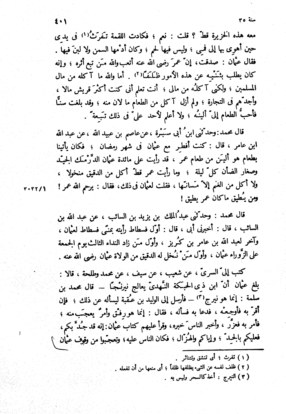 قَالَ مُحَمَّدٌ: وَحَدَّثَنِي ابن أبي سبرة، عن عاصم بن عبيد الله، عن عبد الله ابن عَامِر، قَالَ: كنت أفطر مع عُثْمَان فِي شهر رمضان، فكان يأتينا بطعام هُوَ ألين من طعام عمر، قَدْ رأيت عَلَى مائدة عُثْمَان الدرمك الجيد وصغار الضأن كل ليلة، وما رأيت عمر قط أكل من الدقيق منخولا، وَلا أكل من الغنم إلا مسانها، فقلت لِعُثْمَانَ فِي ذَلِكَ، فَقَالَ: يرحم اللَّه عمر! ومن يطيق مَا كَانَ عمر يطيق! قَالَ مُحَمَّدٌ: وَحَدَّثَنِي عَبْد الْمَلِكِ بن يَزِيدَ بن السَّائِب، عن عَبْد اللَّهِ بن السَّائِب، قَالَ: أَخْبَرَنِي أبي، قَالَ: أول فسطاط رأيته بمنى فسطاط لِعُثْمَانَ، وآخر لعبد اللَّه بن عَامِر بن كريز، وأول من زاد النداء الثالث يوم الجمعة عَلَى الزوراء عُثْمَان، وأول من نخل لَهُ الدقيق من الولاة عُثْمَان رَضِيَ اللَّه عَنْهُ كَتَبَ إِلَيَّ السَّرِيُّ، عَنْ شُعَيْبٍ، عَنْ سَيْفٍ، عَنْ مُحَمَّدٍ وَطَلْحَةَ، قَالا: