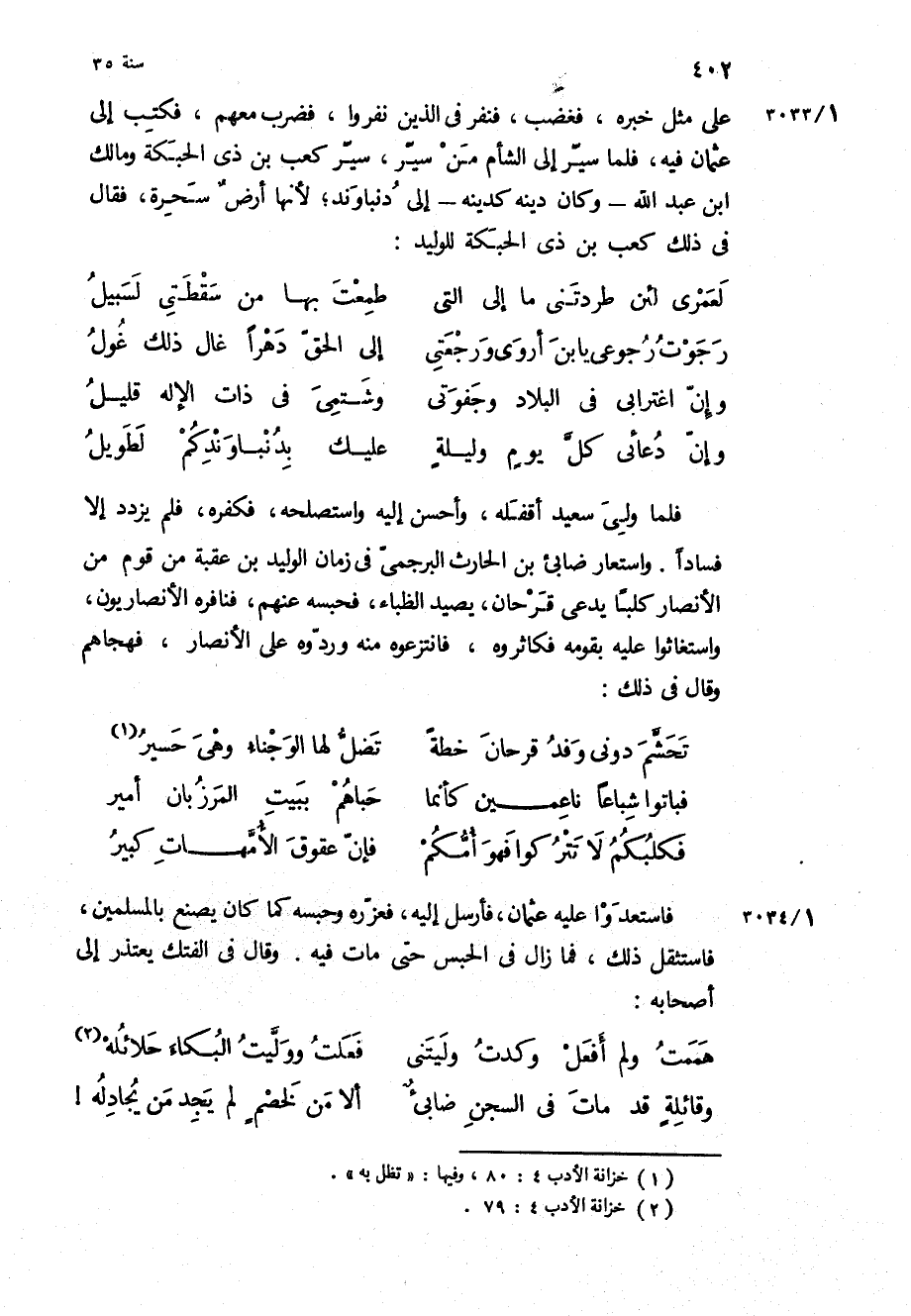 عَلَى مثل خبره، فغضب، فنفر فِي الَّذِينَ نفروا، فضرب معهم، فكتب إِلَى عُثْمَانَ فِيهِ، فلما سير إِلَى الشام من سير، سير كعب بن ذي الحبكه ومالك ابن عَبْدِ اللَّهِ- وَكَانَ دينه كدينه- إِلَى دنباوند، لأنها أرض سحرة، فَقَالَ فِي ذَلِكَ كعب بن ذي الحبكة للوليد: