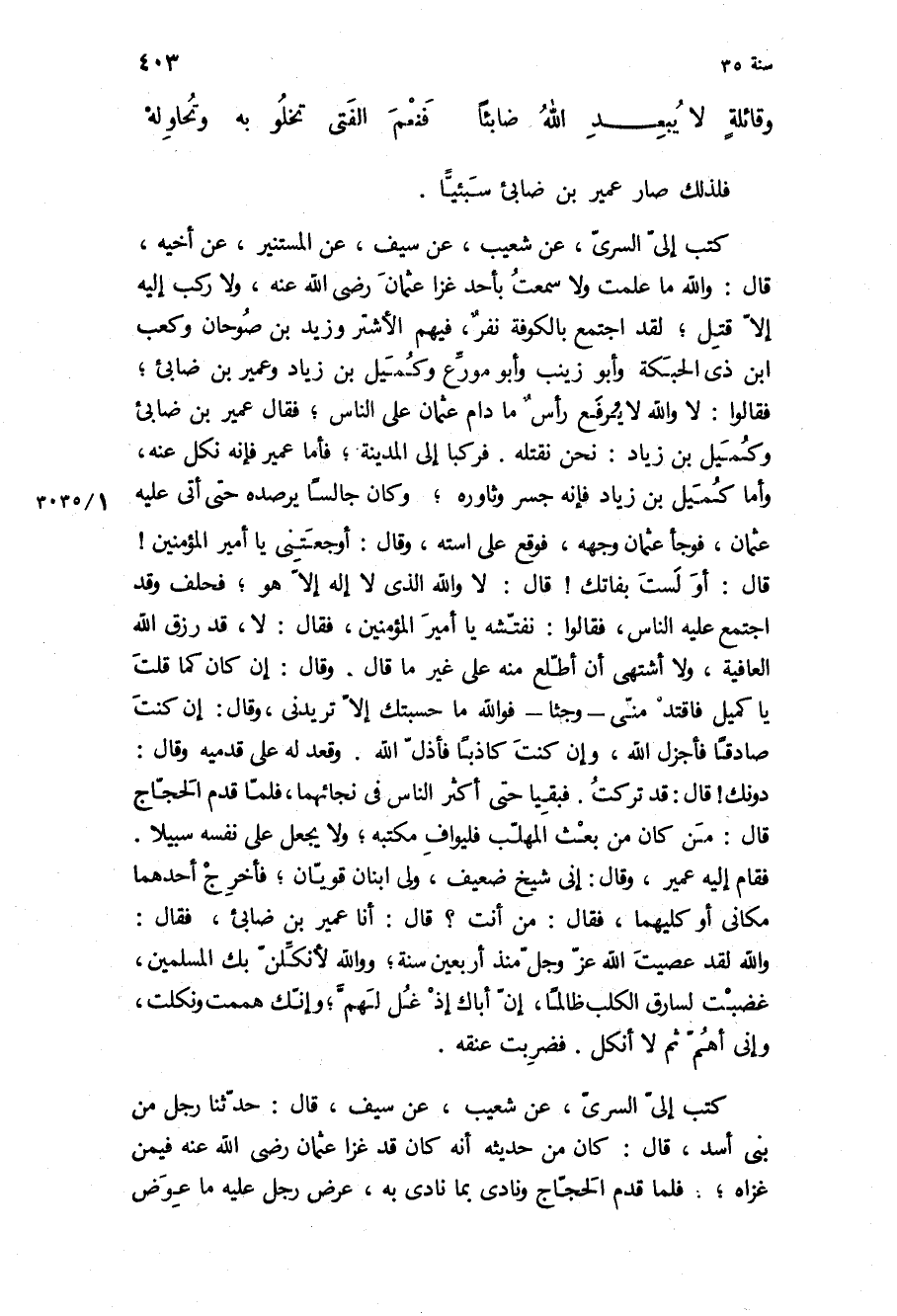 كتب إلي السري، عن شعيب، عن سيف، عن المستنير، عن أخيه، قَالَ: وَاللَّهِ مَا علمت وَلا سمعت بأحد غزا عُثْمَان رَضِيَ اللَّهُ عَنْهُ، وَلا ركب إِلَيْهِ إلا قتل، لقد اجتمع بالكوفة نفر، فِيهِمُ الأَشْتَر وزَيْد بن صوحان وكعب ابن ذي الحبكه وابو زينب وأبو مورع وكميل بن زياد وعمير بن ضابئ، فَقَالُوا: لا وَاللَّهِ لا يرفع رأس مَا دام عُثْمَان عَلَى الناس، فَقَالَ عمير بن ضابئ وكميل بن زياد: نحن نقتله فركبا إِلَى الْمَدِينَةِ، فأما عمير فإنه نكل عنه، وأما كميل بن زياد فإنه جسر وثاوره، وَكَانَ جالسا يرصده حَتَّى أتى عَلَيْهِ عُثْمَان، فوجأ عُثْمَان وجهه، فوقع عَلَى استه، وَقَالَ: أوجعتني يا امير المؤمنين! قال: او لست بفاتك! قَالَ: لا وَاللَّهِ الَّذِي لا إله إلا هُوَ، فحلف وَقَدِ اجتمع عَلَيْهِ الناس، فَقَالُوا: نفتشه يَا أَمِيرَ الْمُؤْمِنِينَ، فَقَالَ: لا، قَدْ رزق اللَّه العافية، وَلا أشتهي أن أطلع مِنْهُ عَلَى غير مَا قَالَ وَقَالَ: إن كَانَ كما قلت يَا كميل فاقتد منى- وجثا- فو الله مَا حسبتك إلا تريدني، وَقَالَ: إن كنت صادقا فأجزل اللَّه، وإن كنت كاذبا فأذل اللَّه وقعد لَهُ عَلَى قدميه وَقَالَ: