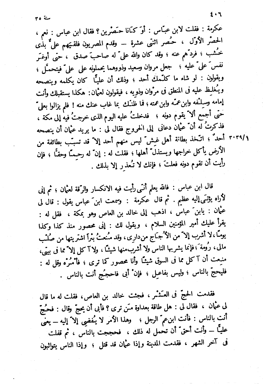 عكرمه: فقلت لابن عباس: او كانا حَصْرَيْنِ؟ فَقَالَ ابْنُ عَبَّاسٍ: نَعَمْ، الْحَصْرُ الأَوَّلُ، حَصْرُ اثْنَتَيْ عَشْرَةَ- وَقَدِمَ الْمِصْرِيُّونَ فَلَقِيَهُمْ عَلِيٌّ بِذِي خَشَبٍ، فَرَدَّهُمْ عَنْهُ، وَقَدْ كَانَ وَاللَّهِ عَلِيٌّ لَهُ صَاحِبُ صِدْقٍ، حَتَّى أَوْغَرَ نَفْسَ عَلِيٍّ عَلَيْهِ، جَعَلَ مَرْوَانُ وَسَعِيدٌ وَذَوُوهُمَا يَحْمِلُونَهُ عَلَى عَلِيٍّ فَيَتَحَمَّلُ، وَيَقُولُونَ: لَوْ شَاءَ مَا كَلَّمَكَ أَحَدٌ، وَذَلِكَ أَنَّ عَلِيًّا كَانَ يُكَلِّمُهُ وَيَنْصَحُهُ وَيَغْلُظُ عَلَيْهِ فِي الْمَنْطِقِ فِي مَرْوَانَ وَذَوِيهِ، فَيَقُولُونَ لِعُثْمَانَ: هَكَذَا يَسْتَقْبِلُكَ وَأَنْتَ إِمَامُهُ وَسَلَفُهُ وَابْنُ عَمِّهِ وَابْنُ عَمَّتِهِ، فَمَا ظَنُّكَ بِمَا غَابَ عَنْكَ مِنْهُ! فَلَمْ يَزَالُوا بِعَلِيٍّ حَتَّى أَجْمَعَ أَلا يَقُومَ دُونَهُ، فَدَخَلْتُ عَلَيْهِ الْيَوْم الَّذِي خَرَجْتُ فِيهِ إِلَى مَكَّةَ، فَذَكَرْتُ لَهُ أَنَّ عُثْمَانَ دَعَانِي إِلَى الْخُرُوجِ فَقَالَ لِي: مَا يُرِيدُ عُثْمَانُ أَنْ يَنْصَحَهُ أَحَدٌ، اتَّخَذَ بِطَانَةَ أَهْلِ غِشٍّ لَيْسَ مِنْهُمْ أَحَدٌ إِلا قَدْ تَسَبَّبَ بِطَائِفَةٍ مِنَ الأَرْضِ يَأْكُلُ خَرَاجَهَا وَيَسْتَذِلُّ أَهْلَهَا، فَقُلْتُ لَهُ: إِنَّ لَهُ رَحِمًا وَحَقًّا، فَإِنْ رَأَيْتَ أَنْ تَقُومَ دُونَهُ فَعَلْتَ، فَإِنَّكَ لا تُعْذَرُ إِلا بِذَلِكَ.