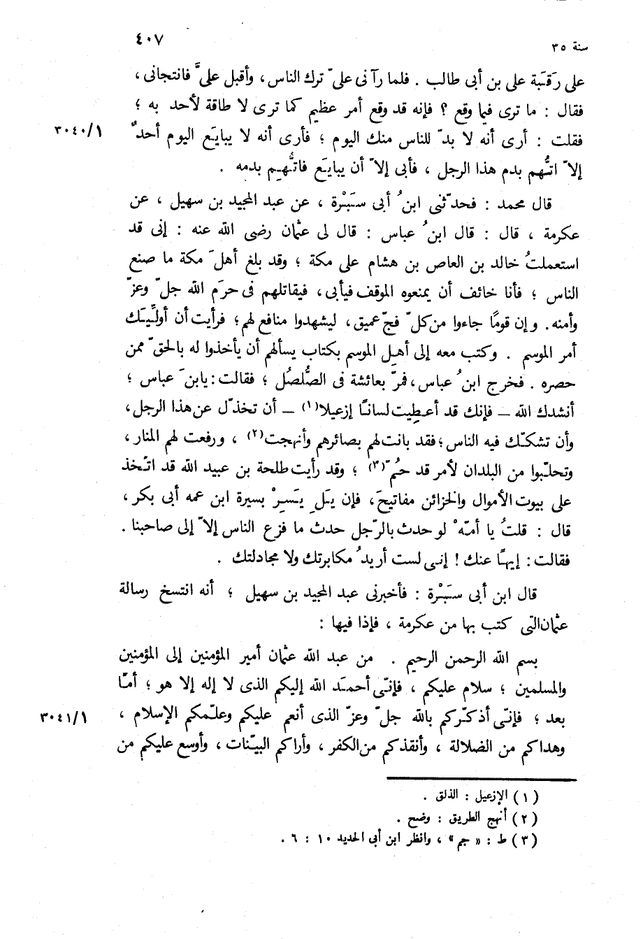 بِسْمِ اللَّه الرَّحْمَنِ الرَّحِيمِ مِنْ عَبْدِ اللَّه عُثْمَانَ أَمِيرِ الْمُؤْمِنِينَ إِلَى الْمُؤْمِنِينَ وَالْمُسْلِمِينَ، سلام عليكم، فإني أحمد الله إليكم الذي لا إله إلا هو، أما بعد، فإني أُذَكِّرُكُمْ بِاللَّهِ جَلَّ وَعَزَّ الَّذِي أَنْعَمَ عَلَيْكُمْ وَعَلَّمَكُمُ الإِسْلامَ، وَهَدَاكُمْ مِنَ الضَّلالَةِ، وَأَنْقَذَكُمْ مِنَ الْكُفْرِ، وَأَرَاكُمُ الْبَيِّنَاتِ، وَأَوْسَعَ عَلَيْكُمْ مِنَ