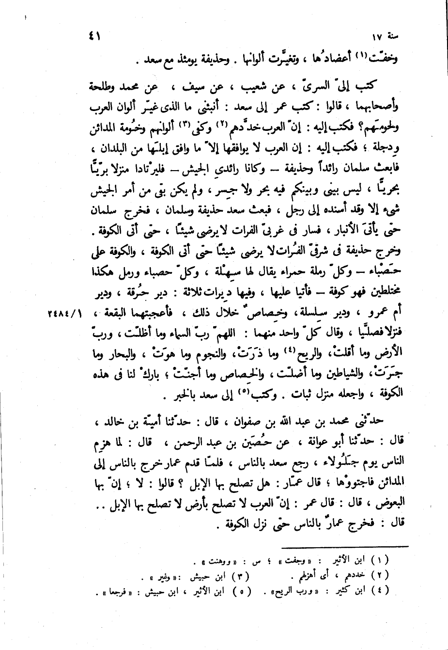 كَتَبَ إِلَيَّ السَّرِيُّ، عَنْ شُعَيْبٍ، عَنْ سَيْفٍ، عَنْ مُحَمَّدٍ وَطَلْحَةَ وَأَصْحَابِهِمَا، قَالُوا: كَتَبَ عُمَرُ إِلَى سَعْدٍ: أَنْبِئْنِي مَا الَّذِي غَيَّرَ أَلْوَانَ الْعَرَبِ وَلُحُومَهُمْ؟ فَكَتَبَ إِلَيْهِ: إِنَّ الْعَرَبَ خَدَّدَهُمْ وَكَفَى أَلْوَانَهُمْ وُخُومَةُ الْمَدَائِنِ وَدِجْلَةَ، فَكَتَبَ إِلَيْهِ: إِنَّ الْعَرَبَ لا يُوَافِقُهَا إِلا مَا وَافَقَ إِبِلَهَا مِنَ الْبُلْدَانِ، فَابْعَثْ سَلْمَانَ رَائِدًا وَحُذَيْفَةَ- وَكَانَا رَائِدَيِ الْجَيْشِ- فَلْيَرْتَادَا مَنْزِلا بَرِّيًّا بَحْرِيًّا، لَيْسَ بَيْنِي وَبَيْنَكُمْ فِيهِ بَحْرٌ وَلا جِسْرٌ، وَلَمْ يَكُنْ بَقِيَ مِنْ أَمْرِ الْجَيْشِ شَيْءٌ إِلا وَقَدْ أَسْنَدَهُ إِلَى رَجُلٍ، فَبَعَثَ سَعْدٌ حُذَيْفَةَ وَسَلْمَانَ، فَخَرَجَ سَلْمَانُ حَتَّى يَأْتِيَ الأَنْبَارَ، فَسَارَ فِي غَرْبَيِّ الْفُرَاتِ لا يَرْضَى شَيْئًا، حَتَّى أَتَى الْكُوفَةَ.