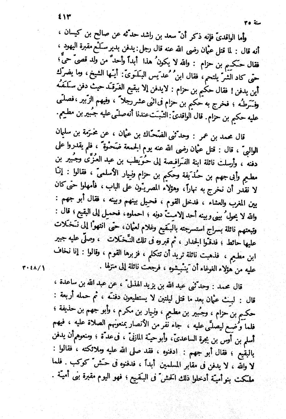 وأما الْوَاقِدِيّ فإنه ذكر أن سعد بن راشد حدثه عن صالح بن كيسان، أنه قال: لما قتل عثمان رضي الله عنه قَالَ رجل: يدفن بدير سلع مقبرة اليهود، فَقَالَ حكيم بن حزام: وَاللَّهِ لا يكون هَذَا أبدا وأحد من ولد قصي حي، حَتَّى كاد الشر يلتحم، فَقَالَ ابن عديس البلوي: أيها الشيخ، وما يضرك أين يدفن! فَقَالَ حكيم بن حزام: لا يدفن إلا ببقيع الغرقد حَيْثُ دفن سلفه وفرطه، فخرج بِهِ حكيم بن حزام فِي اثني عشر رجلا، وفيهم الزُّبَيْر، فصلى عَلَيْهِ حكيم بن حزام قَالَ الْوَاقِدِيُّ: الثبت عندنا أنه صلى عَلَيْهِ جبير بن مطعم قَالَ مُحَمَّدُ بْنُ عُمَرَ: وَحَدَّثَنِي الضحاك بن عُثْمَانَ، عن مخرمة بن سُلَيْمَانَ الوالبي، قَالَ: قتل عُثْمَان رَضِيَ اللَّهُ عَنْهُ يوم الجمعة ضحوة، فلم يقدروا عَلَى دفنه، وأرسلت نائلة ابنة الْفُرَافِصَة إِلَى حويطب بن عبد العزى وجبير بن مطعم وأبي جهم بن حُذَيْفَة وحكيم بن حزام ونيار الأسلمي، فَقَالُوا: إنا لا نقدر أن نخرج بِهِ نهارا، وهؤلاء الْمِصْرِيُّونَ عَلَى الباب، فأمهلوا حَتَّى كَانَ بين المغرب والعشاء، فدخل القوم، فحيل بينهم وبينه، فَقَالَ أَبُو جهم:
