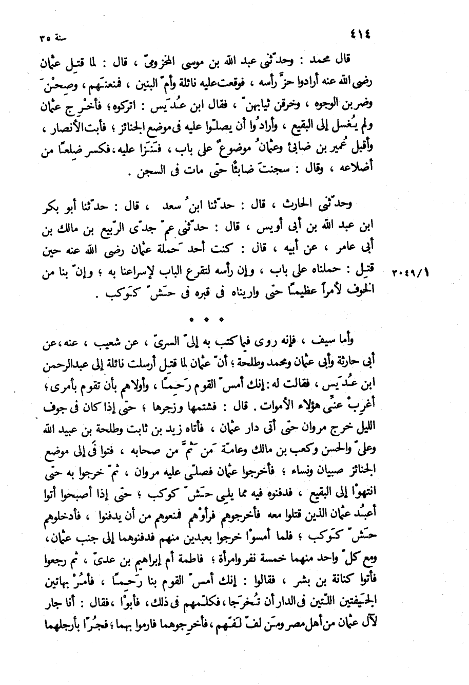 وأما سيف، فإنه روى فِيمَا كتب بِهِ إلي السري، عَنْ شُعَيْبٍ، عنه، عَنْ أَبِي حَارِثَةَ وَأَبِي عُثْمَانَ ومحمد وَطَلْحَة، أن عُثْمَان لما قتل أرسلت نائلة إِلَى عبد الرَّحْمَن ابن عديس، فَقَالَتْ لَهُ: إنك أمس القوم رحما، وأولاهم بأن تقوم بأمري، أغرب عني هَؤُلاءِ الأموات قَالَ: فشتمها وزجرها، حَتَّى إذا كَانَ فِي جوف الليل خرج مَرْوَان حَتَّى أتى دار عُثْمَان، فأتاه زَيْد بن ثَابِت وَطَلْحَة بن عُبَيْد اللَّهِ وعلي والحسن وكعب بن مَالِكٍ وعامة من ثُمَّ من صحابه، فتوافى إِلَى موضع الجنائز صبيان ونساء، فأخرجوا عُثْمَان فصلى عَلَيْهِ مَرْوَان، ثُمَّ خرجوا بِهِ حَتَّى انتهوا إِلَى البقيع، فدفنوه فِيهِ مما يلي حش كوكب، حَتَّى إذا أصبحوا أتوا أعبد عُثْمَان الَّذِينَ قتلوا مَعَهُ فأخرجوهم فرأوهم فمنعوهم من ان يدفنوا، فأدخلوهم حش كوكب، فلما أمسوا خرجوا بعبدين مِنْهُمْ فدفنوهما إِلَى جنب عُثْمَان، ومع كل واحد منهما خمسة نفر وامرأة، فاطمة أم إِبْرَاهِيم بن عدي، ثُمَّ رجعوا فأتوا كنانة بن بشر، فَقَالُوا: إنك أمس القوم بنا رحما، فأمر بهاتين الجيفتين اللتين فِي الدار أن تخرجا، فكلمهم فِي ذَلِكَ، فأبوا، فَقَالَ: أنا جار لآل عُثْمَان من أهل مصر ومن لف لفهم، فاخرجوهما فارموا بهما، فجرا بأرجلهما