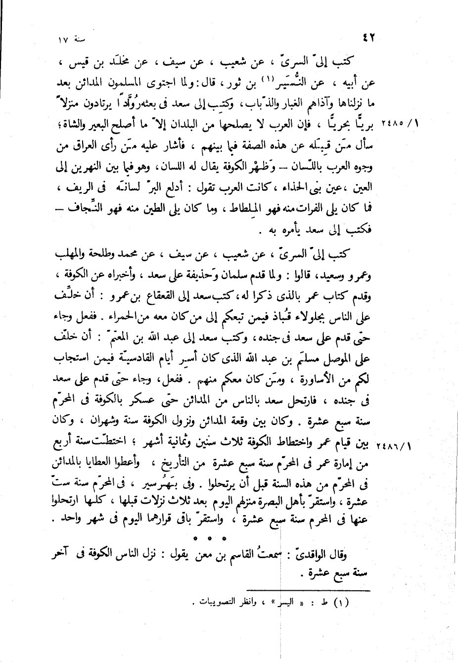 كَتَبَ إِلَيَّ السري، عن شعيب، عن سَيْفٍ، عَنْ مُحَمَّدٍ وَطَلْحَةَ وَالْمُهَلَّبِ وَعَمْرٍو وَسَعِيدٍ، قَالُوا: وَلَمَّا قَدِمَ سَلْمَانُ وَحُذَيْفَةُ عَلَى سَعْدٍ، وَأَخْبَرَاهُ عَنِ الْكُوفَةِ، وَقَدِمَ كِتَابُ عُمَرَ بِالَّذِي ذَكَرَا لَهُ، كَتَبَ سَعْدٌ إِلَى الْقَعْقَاعِ بْنِ عَمْرٍو: أَنْ خَلِّفْ عَلَى النَّاسِ بِجَلُولاءَ قُبَاذَ فِيمَنْ تَبِعَكُمْ إِلَى مَنْ كَانَ مَعَهُ مِنَ الْحَمْرَاءِ فَفَعَلَ وَجَاءَ حَتَّى قَدِمَ عَلَى سَعْدٍ فِي جُنْدِهِ، وَكَتَبَ سَعْدٌ إِلَى عَبْدِ اللَّهِ بْنِ الْمُعْتَمِّ: أَنْ خَلِّفْ عَلَى الْمَوْصِلِ مُسْلِمَ بْنَ عَبْدِ اللَّهِ الَّذِي كَانَ أُسِرَ أَيَّامَ الْقَادِسِيَّةِ فِيمَنِ اسْتَجَابَ لَكُمْ مِنَ الأَسَاوِرَةِ، وَمَنْ كَانَ مَعَكُمْ مِنْهُمْ فَفَعَلَ، وَجَاءَ حَتَّى قَدِمَ عَلَى سَعْدٍ فِي جُنْدِهِ، فَارْتَحَلَ سَعْدٌ بِالنَّاسِ مِنَ الْمَدَائِنِ حَتَّى عَسْكَرَ بِالْكُوفَةِ فِي الْمُحَرَّمِ سَنَةَ سَبْعَ عَشْرَةَ وَكَانَ بَيْنَ وَقْعَةِ الْمَدَائِنِ وَنُزُولِ الْكُوفَةِ سَنَةٌ وَشَهْرَانِ، وَكَانَ بَيْنَ قِيَامِ عُمَرَ وَاخْتِطَاطِ الْكُوفَةِ ثَلاثُ سِنِينَ وَثَمَانِيَةُ أَشْهُرٍ، اخْتُطَّتْ سَنَةَ أَرْبَعٍ مِنْ إِمَارَةِ عُمَرَ فِي الْمُحَرَّمِ سَنَةَ سَبْعَ عَشْرَةَ مِنَ التَّأْرِيخِ، وَأعطوا الْعَطَايَا بِالْمَدَائِنِ فِي الْمُحَرَّمِ مِنْ هَذِهِ السَّنَةِ قَبْلَ أَنْ يَرْتَحِلُوا وفي بهرسير، في المحرم سنه ست عشره، وَاسْتَقَرَّ بِأَهْلِ الْبَصْرَةِ مَنْزِلُهُمُ الْيَوْمَ بَعْدَ ثَلاثِ نَزَلاتٍ قَبْلَهَا، كُلِّهَا ارْتَحَلُوا عَنْهَا فِي الْمُحَرَّمِ سنه سبع عشره، وَاسْتَقَرَّ بَاقِي قَرَارِهِمَا الْيَوْمَ فِي شَهْرٍ وَاحِدٍ.