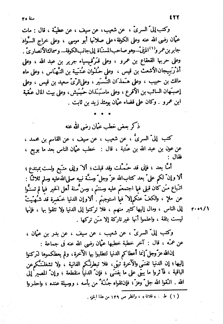 كَتَبَ إِلَيَّ السَّرِيُّ، عَنْ شُعَيْبٍ، عَنْ سَيْفٍ، عَنِ الْقَاسِمِ بْنِ مُحَمَّدٍ، عَنْ عَوْنِ بْنِ عَبْدِ اللَّهِ بْنِ عُتْبَةَ، قَالَ: خَطَبَ عُثْمَانُ النَّاسَ بَعْدَ مَا بُويِعَ، فَقَالَ: