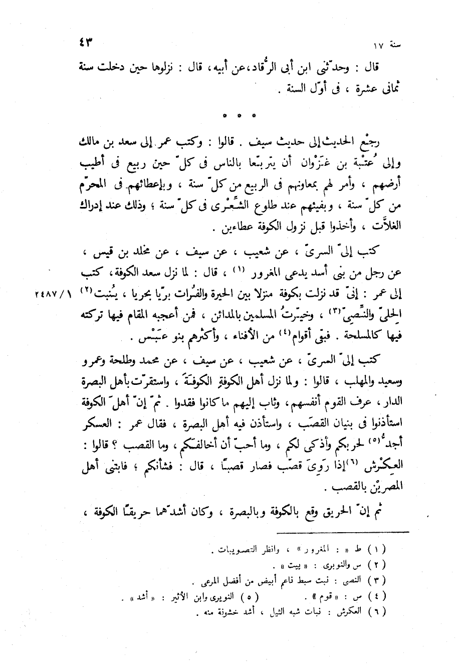 كَتَبَ إِلَيَّ السَّرِيُّ، عن شعيب، عن سيف، عن محمد وطلحة وَعَمْرٍو وَسَعِيدٍ وَالْمُهَلَّبِ، قَالُوا: وَلَمَّا نَزَلَ أَهْلُ الْكُوفَةِ الْكُوفَةَ، وَاسْتَقَرَّتْ بِأَهْلِ الْبَصْرَةِ الدَّارُ، عَرَفَ الْقَوْمُ أَنْفُسَهُمْ، وَثَابَ إِلَيْهِمْ مَا كَانُوا فَقَدُوا ثُمَّ إِنَّ أَهْلَ الْكُوفَةِ اسْتَأْذَنُوا فِي بُنْيَانِ الْقَصَبِ، وَاسْتَأْذَنَ فِيهِ أَهْلُ الْبَصْرَةِ، فَقَالَ عُمَرُ: الْعَسْكَرُ أَجَدُّ لِحَرْبِكُمْ وَأَذْكَى لَكُمْ، وَمَا أُحِبُّ أَنْ أُخَالِفَكُمْ، وَمَا الْقَصَبُ؟ قَالُوا: