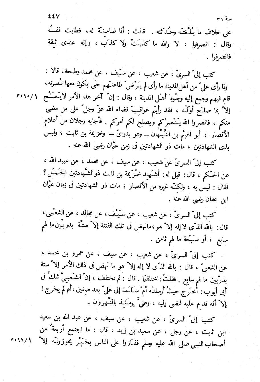 كَتَبَ إِلَيَّ السَّرِيُّ، عَنْ شُعَيْبٍ، عن سيف، عن محمد وطلحة، قالا:
