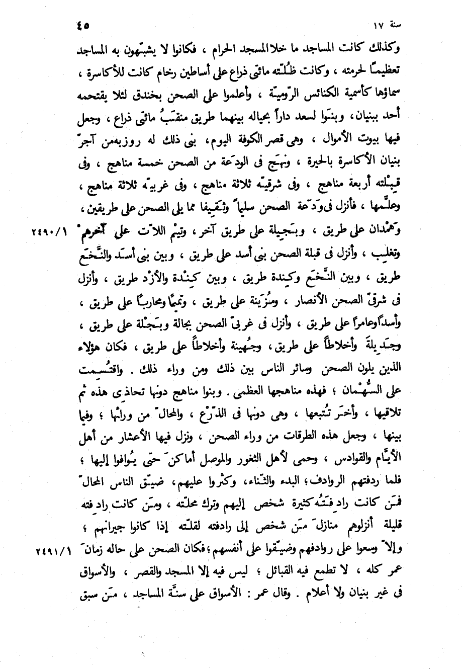 وَكَذَلِكَ كَانَتِ الْمَسَاجِدُ مَا خَلا الْمَسْجِدِ الْحَرَامِ، فَكَانُوا لا يُشْبِهُونَ بِهِ الْمَسَاجِدَ تَعْظِيمًا لِحُرْمَتِهِ، وَكَانَتْ ظِلَّتُهُ مِائَتَيْ ذِرَاعٍ عَلَى أَسَاطِينَ رُخَامٍ كَانَتْ لِلأَكَاسِرَةِ، سَمَاؤُهَا كَأَسْمِيَةِ الْكَنَائِسِ الرُّومِيَّةِ، وَأَعْلَمُوا عَلَى الصَّحْنِ بِخَنْدَقٍ لِئَلا يَقْتَحِمَهُ أَحَدٌ بِبُنْيَانٍ، وَبَنَوْا لِسَعْدٍ دَارًا بِحِيَالِهِ بَيْنَهُمَا طَرِيقٌ مَنْقَبٌ مِائَتَيْ ذِرَاعٍ، وَجَعَلَ فِيهَا بُيُوتَ الأَمْوَالِ، وَهِيَ قَصْرُ الْكُوفَةِ الْيَوْمَ، بَنَى ذَلِكَ لَهُ روزبه مِنْ آجر بُنْيَانِ الأَكَاسِرَةِ بِالْحِيرَةِ، وَنَهَجَ فِي الْوَدَعَةِ مِنَ الصَّحْنِ خَمْسَةَ مَنَاهِجَ، وَفِي قِبْلَتِهِ أَرْبَعَةُ مَنَاهِجَ، وَفِي شَرْقِيِّهِ ثَلاثَةُ مَنَاهِجَ، وَفِي غَرْبِيِّهِ ثَلاثَةُ مَنَاهِجَ، وَعَلَمُهَا، فَأَنْزَلَ فِي وَدَعَةِ الصَّحْنِ سَلِيمًا وَثَقِيفًا مِمَّا يَلِي الصَّحْنَ عَلَى طَرِيقَيْنِ، وَهَمْدَانُ عَلَى طَرِيقٍ، وَبَجِيلَةَ عَلَى طَرِيقٍ آخَرَ، وَتَيْمِ اللاتِ عَلَى آخِرِهِمْ وَتَغْلِبَ، وَأَنْزَلَ فِي قِبْلَةِ الصَّحْنِ بَنِي أَسَدٍ عَلَى طَرِيقٍ، وَبَيْنَ بَنِي أَسَدٍ وَالنَّخْعِ طَرِيقٌ، وَبَيْنَ النَّخْعِ وَكِنْدَةَ طَرِيقٌ، وَبَيْنَ كِنْدَةَ وَالأَزْدِ طَرِيقٌ، وَأَنْزَلَ فِي شَرْقِيِّ الصَّحْنِ الأَنْصَارَ، وَمُزَيْنَةَ عَلَى طَرِيقٍ، وَتَمِيمًا وَمُحَارِبًا عَلَى طَرِيقٍ، وَأَسَدًا وَعَامِرًا عَلَى طَرِيقٍ، وَأَنْزَلَ فِي غَرْبِيِّ الصَّحْنِ بِجَالَةَ وَبَجَلَةَ عَلَى طَرِيقٍ، وَجديلَةَ وَأَخْلاطًا عَلَى طَرِيقٍ، وَجُهَيْنَةَ واخلاطا عَلَى طَرِيقٍ، فَكَانَ هَؤُلاءِ الَّذِينَ يَلُونَ الصَّحْنَ وَسَائِرُ النَّاسِ بَيْنَ ذَلِكَ وَمِنْ وَرَاءِ ذَلِكَ وَاقْتَسَمَتْ عَلَى السّهمان، فَهَذِهِ مَنَاهِجُهَا الْعُظْمَى وَبَنَوْا مَنَاهِجَ دُونَهَا تُحَاذِي هَذِهِ ثُمَّ تُلاقِيهَا، وَأُخَرَ تَتْبَعُهَا، وَهِيَ دُونَهَا فِي الذَّرْعِ، وَالْمَحَال من ورائها، وفيما بينها، جعل هذه الطرقات من وراء الصحن، ونزل فيها الأعشار من أهل الأيام والقوادس، وحمى لأهل الثغور والموصل أماكن حتى يوافوا إليها، فلما ردفتهم الروادف، البدء والثناء، وكثروا عليهم، ضيق الناس المحال فمن كانت رادفته كثيرة شخص إليهم وترك محلته، ومن كانت رادفته قليلة أنزلوهم منازل من شخص إلى رادفته لقلته إذا كانوا جيرانهم، وإلا وسعوا على روادفهم وضيقوا على أنفسهم، فكان الصحن على حاله زمان عمر كله، لا تطمع فيه القبائل، ليس فيه إلا المسجد والقصر، والأسواق في غير بنيان ولا أعلام وقال عمر: الأسواق على سنة المساجد، من سبق