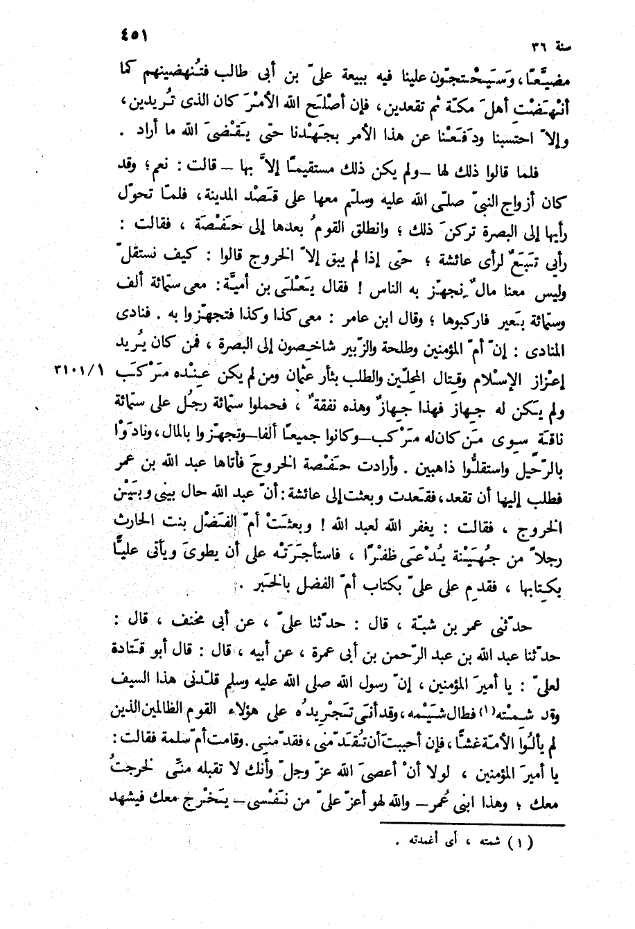 رَأْيِي تَبَعٌ لِرَأْيِ عَائِشَةَ، حَتَّى إِذَا لَمْ يَبْقَ إِلا الْخُرُوجُ قَالُوا: كَيْفَ نَسْتَقِلُّ وَلَيْسَ مَعَنَا مَالٌ نُجَهِّزُ بِهِ الناس! فقال يعلى بن اميه: معى ستمائه الف وستمائه بَعِيرٍ فَارْكَبُوهَا، وَقَالَ ابْنُ عَامِرٍ: مَعِي كَذَا وَكَذَا فَتَجَهَّزُوا بِهِ فَنَادَى الْمُنَادِي: أَنَّ أُمَّ الْمُؤْمِنِينَ وَطَلْحَةَ وَالزُّبَيْرَ شَاخِصُونَ إِلَى الْبَصْرَةِ، فَمَنْ كَانَ يُرِيدُ إِعْزَازَ الإِسْلامِ وَقِتَالَ الْمُحِلِّينَ وَالطَّلَبَ بثار عثمان ومن لَمْ يَكُنْ عِنْدَهُ مَرْكَبٌ وَلَمْ يَكُنْ لَهُ جهاز فهذا جهاز وهذه نفقه، فحملوا ستمائه رجل على ستمائه نَاقَةٍ سِوَى مَنْ كَانَ لَهُ مَرْكَبٌ- وَكَانُوا جَمِيعًا أَلْفًا- وَتَجَهَّزُوا بِالْمَالِ، وَنَادَوْا بِالرَّحِيلِ وَاسْتَقَلُّوا ذَاهِبِينَ وَأَرَادَتْ حَفْصَةُ الْخُرُوجَ فَأَتَاهَا عَبْدُ اللَّهِ بْنُ عُمَرَ فَطَلَبَ إِلَيْهَا أَنْ تَقْعُدَ، فَقَعَدَتْ وَبَعَثَتْ إِلَى عَائِشَةَ: إِنَّ عَبْدَ اللَّهِ حَالَ بَيْنِي وَبَيْنَ الْخُرُوجِ، فَقَالَتْ: يَغْفِرُ اللَّهُ لِعَبْدِ اللَّهِ! وَبَعَثَتْ أُمُّ الْفَضْلِ بِنْتُ الْحَارِثِ رَجُلا مِنْ جُهَيْنَةَ يُدْعَى ظُفُرًا، فَاسْتَأْجَرَتْهُ عَلَى أَنْ يَطْوِيَ وَيَأْتِيَ عَلِيًّا بِكِتَابِهَا، فَقَدِمَ عَلَى عَلِيٍّ بِكِتَابِ أُمِّ الْفَضْلِ بِالْخَبَرِ.