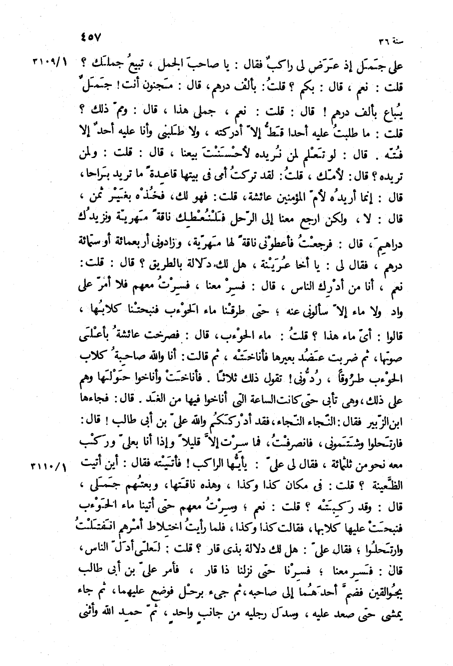 فَارْتَحَلُوا وَشَتَمُونِي، فَانْصَرَفْتُ، فَمَا سِرْتُ إِلا قَلِيلا وَإِذَا أَنَا بِعَلِيٍّ وَرَكْبٍ معه نحو من ثلاثمائة، فقال لي على: يا ايها الرَّاكِبُ! فَأَتَيْتُهُ فَقَالَ: أَيْنَ أَتَيْتَ الظَّعِينَةَ؟ قُلْتُ: فِي مَكَانِ كَذَا وَكَذَا، وَهَذِهِ نَاقَتُهَا، وَبِعْتُهُمْ جَمَلِي، قَالَ: وَقَدْ رَكِبَتْهُ؟ قُلْتُ: نَعَمْ، وَسِرْتُ مَعَهُمْ حَتَّى أَتَيْنَا مَاءَ الْحَوْأَبِ فَنَبَحَتْ عَلَيْهَا كَلابُهَا، فَقَالَتْ كَذَا وَكَذَا، فَلَمَّا رَأَيْتُ اخْتِلاطَ أَمْرِهِمْ انْفَتَلْتُ وَارْتَحَلُوا، فَقَالَ عَلِيٌّ: هَلْ لَكَ دِلالَةٌ بِذِي قَارٍ؟ قُلْتُ: لِعَلِيٍّ أَدُلُّ النَّاسَ، قَالَ: فَسِرْ مَعَنَا، فَسِرْنَا حَتَّى نَزَلْنَا ذَا قَارٍ، فَأَمَرَ عَلِيُّ بْنُ أَبِي طَالِبٍ بِجِوَالِقَيْنِ فَضَمَّ أَحَدَهُمَا إِلَى صَاحِبِهِ، ثُمَّ جِيءَ بِرَحْلٍ فَوُضِعَ عَلَيْهِمَا، ثُمَّ جَاءَ يَمْشِي حَتَّى صَعِدَ عَلَيْهِ، وَسَدَلَ رِجْلَيْهِ مِنْ جَانِبٍ وَاحِدٍ، ثُمَّ حمد الله وأثنى