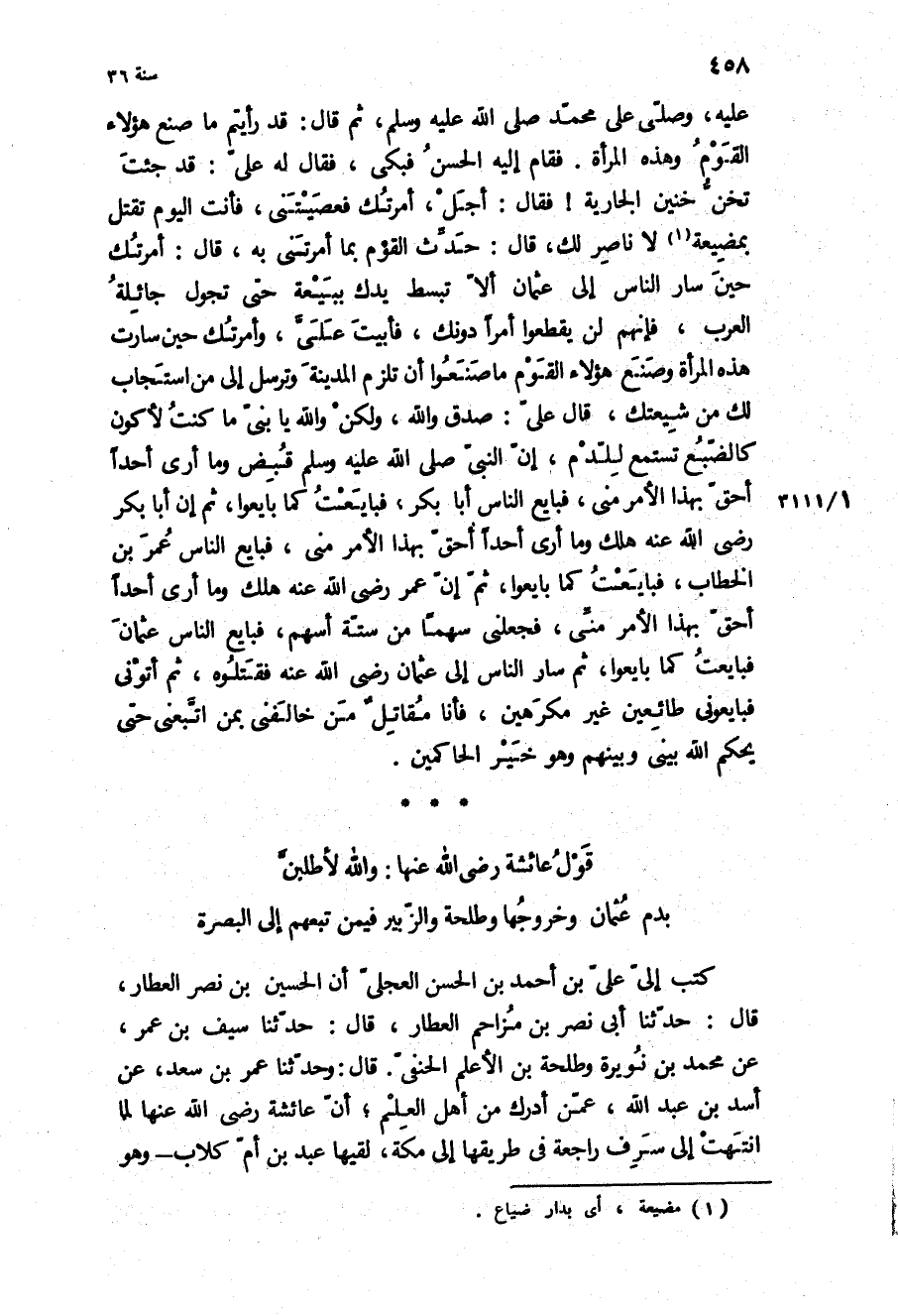 . قَوْلُ عَائِشَةَ رَضِيَ اللَّهُ عَنْهَا: وَاللَّهِ لأَطْلُبَنَّ بِدَمِ عُثْمَانَ وَخُرُوجُهَا وَطَلْحَةُ وَالزُّبَيْرُ فِيمَنْ تَبِعَهُمْ إِلَى الْبَصْرَةِ