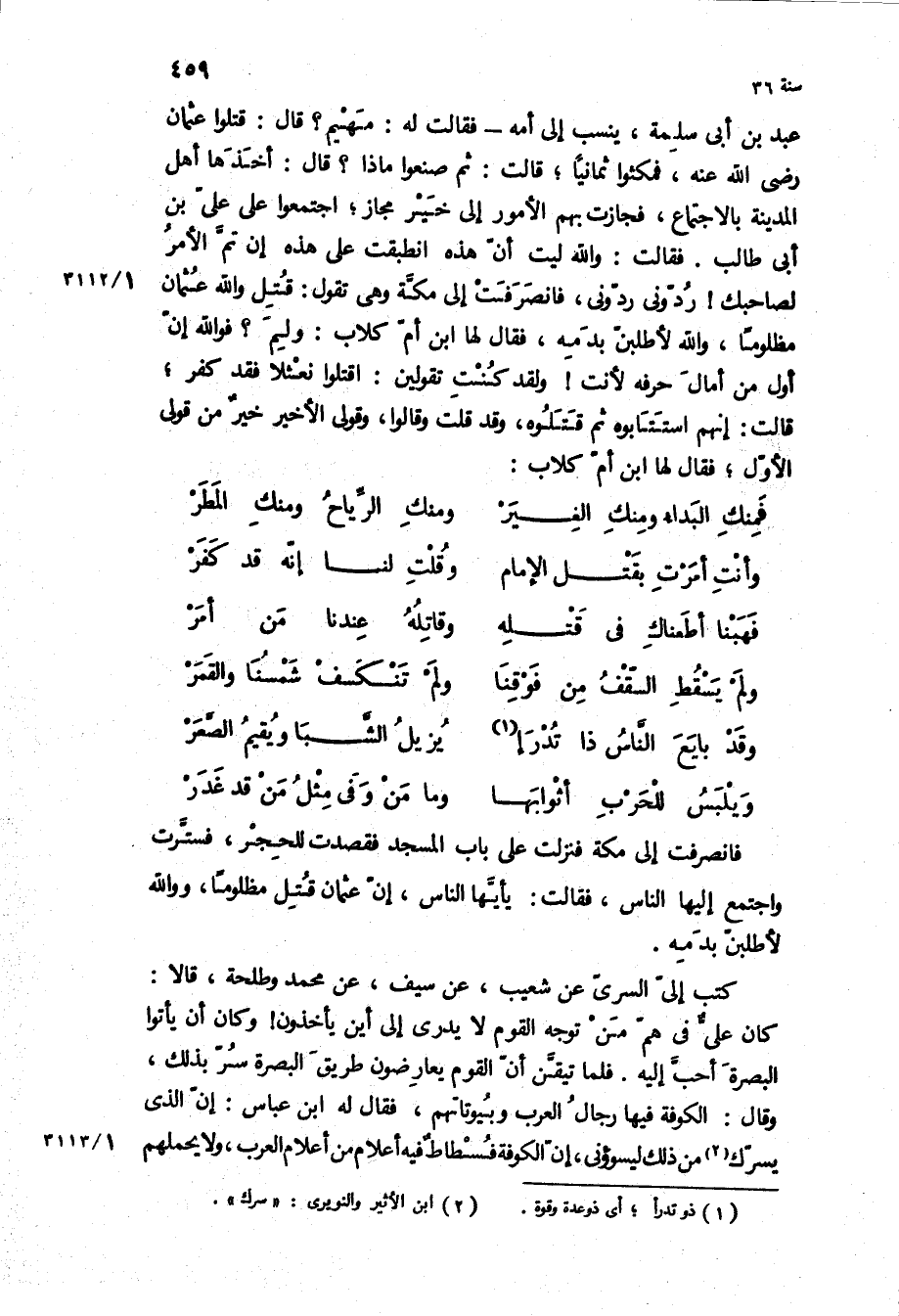 عَبْدُ بْنُ أَبِي سَلَمَةَ، يُنْسَبُ إِلَى أُمِّهِ- فَقَالَتْ لَهُ: مَهْيَمْ؟ قَالَ: قَتَلُوا عُثْمَانَ رَضِيَ اللَّهُ عَنْهُ، فَمَكَثُوا ثَمَانِيًا، قَالَتْ: ثُمَّ صَنَعُوا مَاذَا؟ قَالَ: أَخَذَهَا أَهْلُ الْمَدِينَةِ بِالاجْتِمَاعِ، فَجَازَتْ بِهِمُ الأُمُورُ إِلَى خَيْرِ مُجَازٍ، اجْتَمَعُوا عَلَى عَلِيِّ بْنِ أَبِي طَالِبٍ فَقَالَتْ: وَاللَّهِ لَيْتَ أَنَّ هَذِهِ انْطَبَقَتْ عَلَى هَذِهِ إِنْ تَمَّ الأَمْرُ لِصَاحِبِكَ! رُدُّونِي رُدُّونِي، فَانْصَرَفَتْ إِلَى مَكَّةَ وَهِيَ تَقُولُ: قُتِلَ وَاللَّهِ عُثْمَانُ مَظْلُومًا، وَاللَّهِ لأَطْلُبَنَّ بِدَمِهِ، فَقَالَ لَهَا ابْنُ أُمِّ كِلابٍ: ولم؟ فو الله إِنَّ أَوَّلُ مَنْ أَمَالَ حَرْفَهُ لأَنْتِ! وَلَقَدْ كُنْتِ تَقُولِينَ: اقْتُلُوا نَعْثَلا فَقَدْ كَفَرَ، قَالَتْ: إِنَّهُمُ اسْتَتَابُوهُ ثُمَّ قَتَلُوهُ، وَقَدْ قُلْتُ وَقَالُوا، وَقَوْلِي الأَخِيرُ خَيْرٌ مِنْ قَوْلِي الأَوَّلِ، فَقَالَ لَهَا ابْنُ أُمِّ كِلابٍ: