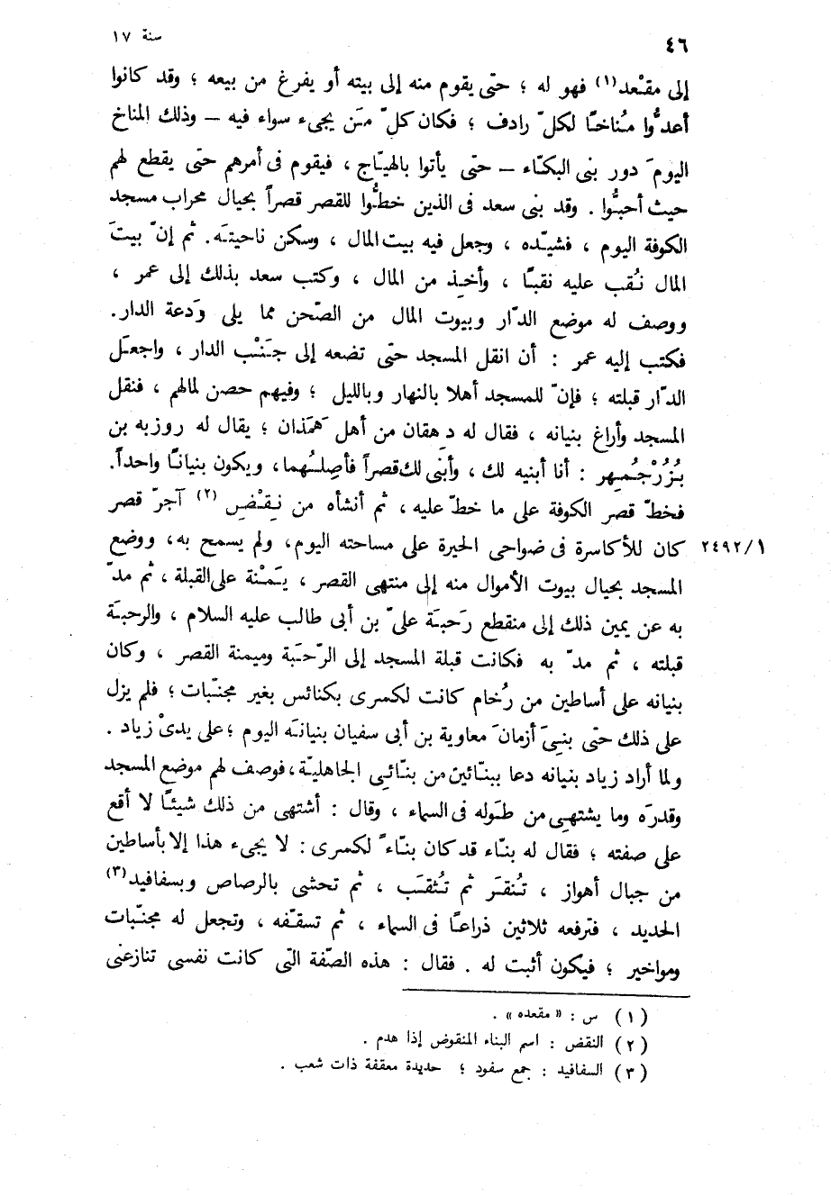 فكتب إليه عمر: أن انقل المسجد حتى تضعه إلى جنب الدار، واجعل الدار قبلته، فإن للمسجد أهلا بالنهار وبالليل، وفيهم حصن لمالهم، فنقل المسجد وأراغ بنيانه، فقال له دهقان من أهل همذان، يقال له روزبه بْن بزرجمهر: أنا أبنيه لك، وأبني لك قصرا فأصلهما، ويكون بنيانا واحدا فخط قصر الكوفة على ما خط عليه، ثم أنشأه من نقض آجر قصر كان للأكاسرة في ضواحي الحيرة على مساحته اليوم، ولم يسمح به، ووضع المسجد بحيال بيوت الأموال منه إلى منتهى القصر، يمنة على القبلة، ثم مد به عن يمين ذلك إلى منقطع رحبة على بن ابى طالب ع، والرحبة قبلته، ثم مد به فكانت قبلة المسجد إلى الرحبة وميمنة القصر، وكان بنيانه على أساطين من رخام كانت لكسرى بكنائس بغير مجنبات، فلم يزل على ذلك حتى بني أزمان معاوية بْن أبي سفيان بنيانه اليوم، على يدي زياد.
