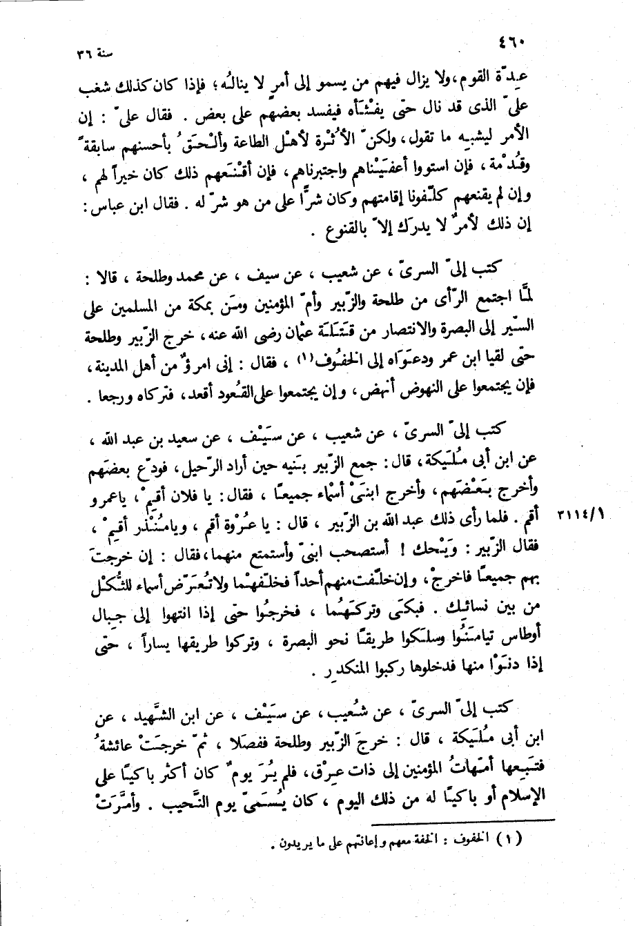 كَتَبَ إلي السري، عن شعيب، عن سيف، عن ابْنِ الشَّهِيدِ، عن ابن أبي مليكة، قَالَ: خرج الزُّبَيْر وَطَلْحَة ففصلا، ثُمَّ خرجت عَائِشَةُ فتبعها أمهات الْمُؤْمِنِينَ إِلَى ذات عرق، فلم ير يوم كَانَ أكثر باكيا عَلَى الإِسْلام أو باكيا لَهُ من ذَلِكَ الْيَوْم، كَانَ يسمى يوم النحيب وأمرت
