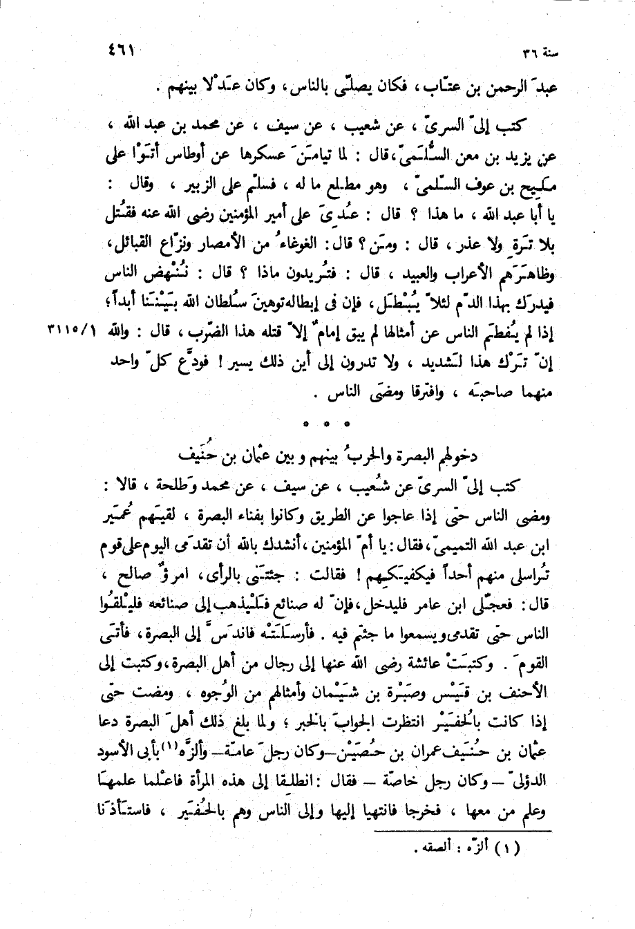 عبد الرَّحْمَن بن عتاب، فكان يصلي بِالنَّاسِ، وَكَانَ عدلا بَيْنَهُمْ كَتَبَ إِلَيَّ السَّرِيُّ، عَنْ شُعَيْبٍ، عَنْ سَيْفٍ، عَنْ مُحَمَّدِ بْنِ عَبْدِ اللَّهِ، عَنْ يَزِيدَ بْنِ معن السلمي، قَالَ: لما تيامن عسكرها عن أوطاس أتوا عَلَى مليح بن عوف السلمى، وهو مطلع ما له، فسلم عَلَى الزُّبَيْر، وَقَالَ: