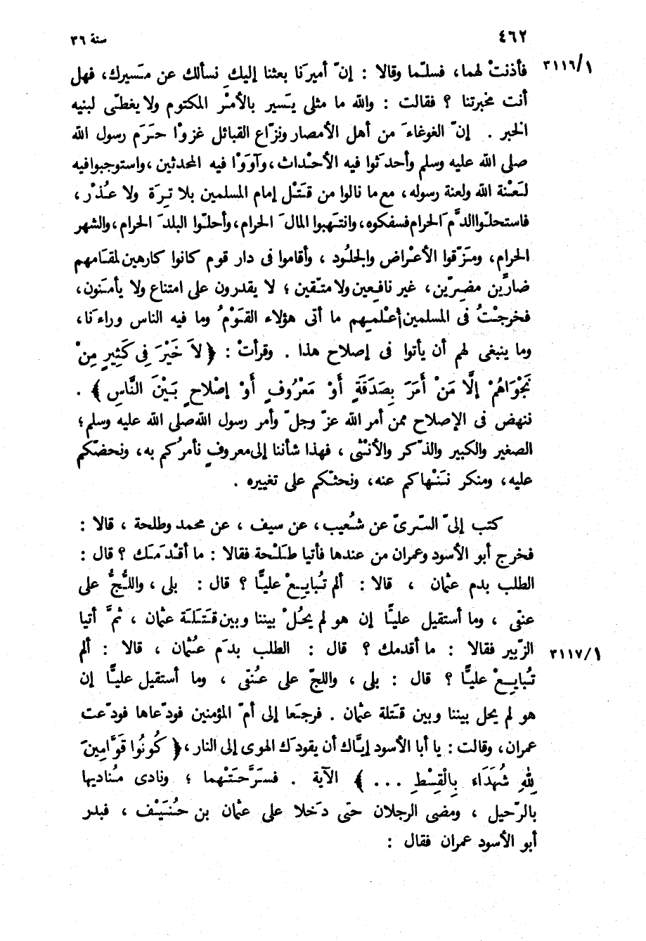 الطَّلَبُ بدم عثمان، قَالا: أَلَمْ تُبَايِعْ عَلِيًّا؟ قَالَ: بَلَى، وَاللُّجُّ عَلَى عُنُقِي، وَمَا أَسْتَقِيلُ عَلِيًّا إِنْ هُوَ لَمْ يَحُلْ بَيْنَنَا وَبَيْنَ قَتَلَةِ عُثْمَانَ، ثُمَّ أَتَيَا الزُّبَيْرَ فَقَالا: مَا أَقْدَمَكَ؟ قَالَ: الطَّلَبُ بدم عثمان، قَالا: أَلَمْ تُبَايِعْ عَلِيًّا؟ قَالَ: بَلَى، وَاللُّجُّ عَلَى عُنُقِي، وَمَا أَسْتَقِيلُ عَلِيًّا إِنْ هُوَ لَمْ يَحُلْ بَيْنَنَا وَبَيْنَ قَتَلَةِ عُثْمَانَ فَرَجَعَا إِلَى أُمِّ الْمُؤْمِنِينَ فَوَدَّعَاهَا فَوَدَّعَتْ عِمْرَانَ، وَقَالَتْ: يَا أَبَا الأَسْوَدِ إِيَّاكَ أَنْ يَقُودَكَ الْهَوَى إِلَى النَّارِ، «كُونُوا قَوَّامِينَ لِلَّهِ شُهَداءَ بِالْقِسْطِ» الآيَةَ فَسَرَّحَتْهُمَا، وَنَادَى مُنَادِيهَا بِالرَّحِيلِ، وَمَضَى الرَّجُلانِ حَتَّى دَخَلا عَلَى عُثْمَانَ بْنِ حُنَيْفٍ، فَبَدَرَ ابو الأسود عمران فقال: