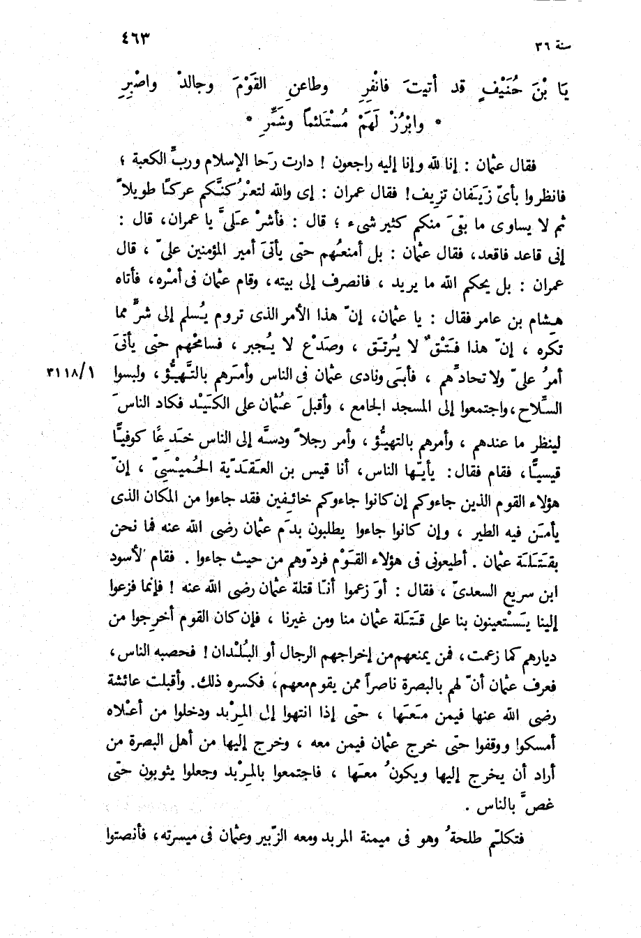 إِنِّي قَاعِدٌ فَاقْعُدْ، فَقَالَ عُثْمَانُ: بَلْ أَمْنَعُهُمْ حَتَّى يَأْتِيَ أَمِيرُ الْمُؤْمِنِينَ عَلِيٌّ، قَالَ عِمْرَان: بَلْ يَحْكُمُ اللَّهُ مَا يُرِيدُ، فَانْصَرَفَ إِلَى بَيْتِهِ، وَقَامَ عُثْمَانُ فِي أَمْرِهِ، فَأَتَاهُ هِشَامُ بْنُ عَامِرٍ فَقَالَ: يَا عُثْمَانُ، إِنَّ هَذَا الأَمْرَ الَّذِي تَرُومُ يُسْلِمُ إِلَى شَرٍّ مِمَّا تَكْرَهُ، إِنَّ هَذَا فَتْقٌ لا يُرْتَقُ، وَصَدْعٌ لا يُجْبَرُ، فَسَامِحْهُمْ حَتَّى يَأْتِيَ أَمْرُ عَلِيٍّ ولاتحادهم، فَأَبَى وَنَادَى عُثْمَانُ فِي النَّاسِ وَأَمَرَهُمْ بِالتَّهَيُّؤِ، وَلَبِسُوا السِّلاحَ، وَاجْتَمَعُوا إِلَى الْمَسْجِدِ الْجَامِعِ، وَأَقْبَلَ عُثْمَانُ عَلَى الْكَيْدِ فَكَادَ النَّاسَ لِيَنْظُرَ مَا عِنْدَهُمْ، وَأَمَرَهُمْ بِالتَّهَيُّؤِ، وَأَمَرَ رَجُلا وَدَسَّهُ إِلَى الناس خدعا كوفيا قيسيا، فقام فقال: يا ايها الناس، انا قيس بن الْعُقْدِيَّةِ الْحُمَيْسِيُّ، إِنَّ هَؤُلاءِ الْقَوْمَ الَّذِينَ جَاءُوكُمْ إِنْ كَانُوا جَاءُوكُمْ خَائِفِينَ فَقَدْ جَاءُوا مِنَ الْمَكَانِ الَّذِي يَأْمَنُ فِيهِ الطَّيْرُ، وَإِنْ كَانُوا جَاءُوا يَطْلُبُونَ بِدَمِ عُثْمَانَ رَضِيَ اللَّهُ عَنْهُ فَمَا نَحْنُ بِقَتَلَةِ عُثْمَانَ أَطِيعُونِي فِي هَؤُلاءِ الْقَوْمِ فَرُدُّوهُمْ مِنْ حَيْثُ جَاءُوا فَقَامَ الأَسْوَدُ ابن سريع السعدي، فقال: او زعموا أَنَّا قَتَلَةُ عُثْمَانَ رَضِيَ اللَّهُ عَنْهُ! فَإِنَّمَا فَزِعُوا إِلَيْنَا يَسْتَعِينُونَ بِنَا عَلَى قَتَلَةِ عُثْمَانَ مِنَّا وَمِنْ غَيْرِنَا، فَإِنْ كَانَ الْقَوْمُ أُخْرِجُوا مِنْ دِيَارِهِمْ كَمَا زَعَمْتَ، فَمَنْ يَمْنَعُهُمْ مِنْ إِخْرَاجِهِمُ الرِّجَالَ أَوِ الْبُلْدَانَ! فَحَصَبَهُ النَّاسُ، فَعَرَفَ عُثْمَانُ أَنَّ لَهُمْ بِالْبَصْرَةِ نَاصِرًا مِمَّنْ يَقُومُ مَعَهُمْ، فَكَسَرَهُ ذَلِكَ وَأَقْبَلَتْ عَائِشَةُ رَضِيَ اللَّهُ عَنْهَا فِيمَنْ مَعَهَا، حَتَّى إِذَا انْتَهَوْا إِلَى الْمِرْبَدِ وَدَخَلُوا مِنْ أَعْلاهُ أَمْسَكُوا وَوَقَفُوا حَتَّى خَرَجَ عُثْمَانُ فِيمَنْ مَعَهُ، وَخَرَجَ إِلَيْهَا مِنْ أَهْلِ الْبَصْرَةِ مَنْ أَرَادَ أَنْ يَخْرُجَ إِلَيْهَا وَيَكُونَ مَعَهَا، فَاجْتَمَعُوا بِالْمِرْبَدِ وَجَعَلُوا يَثُوبُونَ حَتَّى غَصَّ بِالنَّاسِ.