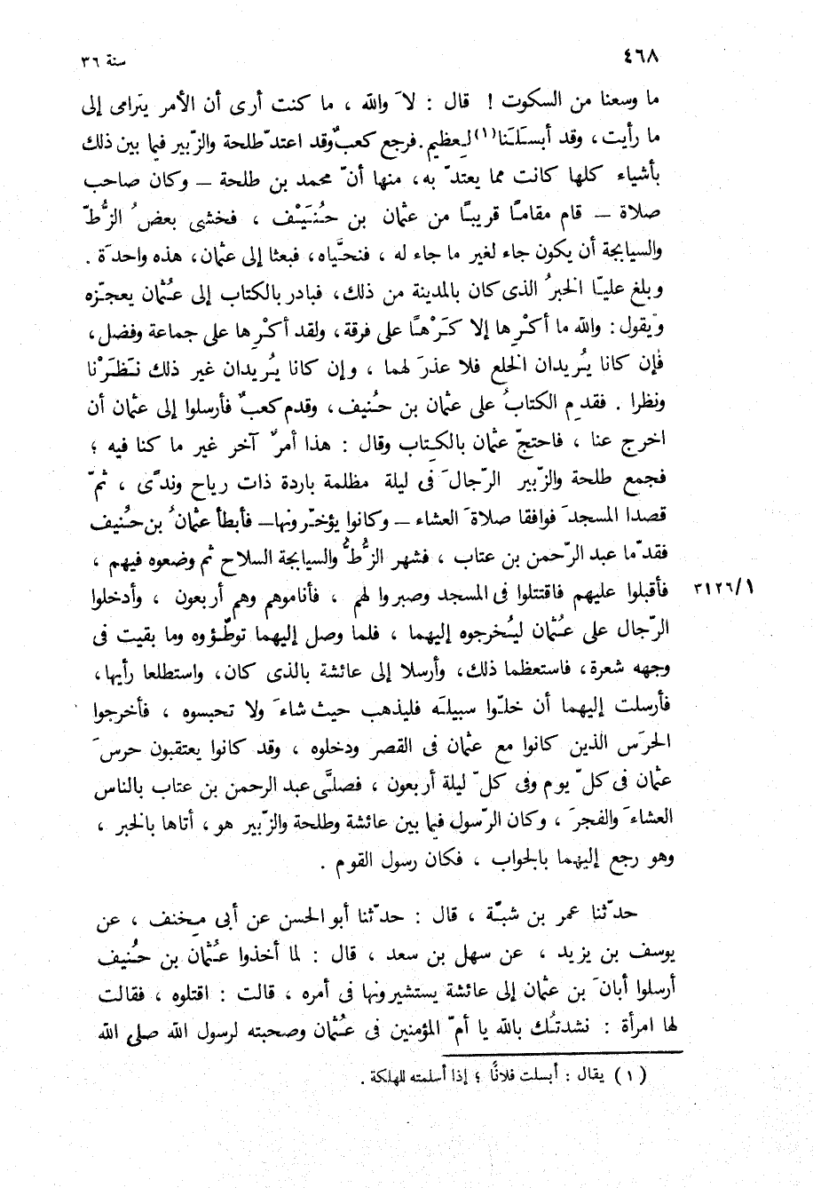 حدثنا عمر بن شبة، قال: حدثنا أبو الْحَسَنِ عَنْ أَبِي مِخْنَفٍ، عَنْ يُوسُفَ بْنِ يَزِيدَ، عَنْ سَهْلِ بْنِ سَعْدٍ، قَالَ: لَمَّا أَخَذُوا عُثْمَانَ بْنَ حُنَيْفٍ أَرْسَلُوا أَبَانَ بْنَ عُثْمَانَ إِلَى عَائِشَةَ يَسْتَشِيرُونَهَا فِي أَمْرِهِ، قَالَتِ: اقْتُلُوهُ، فَقَالَتْ لَهَا امْرَأَةٌ: نَشَدْتُكِ بِاللَّهِ يَا أُمَّ الْمُؤْمِنِينَ فِي عُثْمَانَ وَصُحْبَتِهِ لِرَسُولِ اللَّهِ صلى الله