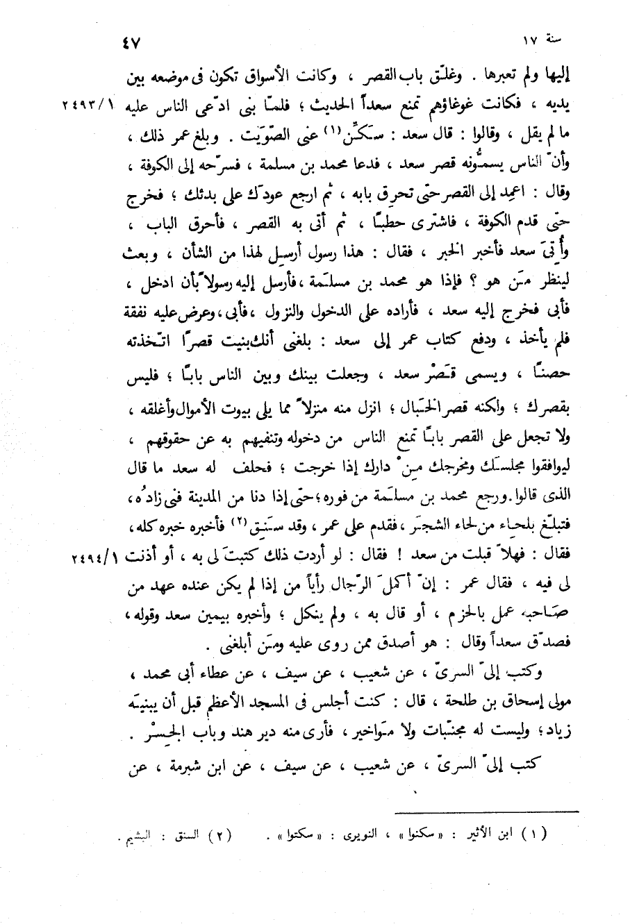 إليها ولم تعبرها وغلق باب القصر، وكانت الأسواق تكون في موضعه بين يديه، فكانت غوغاؤهم تمنع سعدا الحديث، فلما بنى ادعى الناس عليه ما لم يقل، وقالوا: قال سعد: سكن عني الصويت وبلغ عمر ذلك، وأن الناس يسمونه قصر سعد، فدعا مُحَمَّد بْن مسلمة، فسرحه إلى الكوفة، وقال: اعمد إلى القصر حتى تحرق بابه، ثم ارجع عودك على بدئك، فخرج حتى قدم الكوفة، فاشترى حطبا، ثم أتى به القصر، فأحرق الباب، وأتي سعد فأخبر الخبر، فقال: هذا رسول أرسل لهذا من الشأن، وبعث لينظر من هو؟ فإذا هو مُحَمَّد بْن مسلمة، فأرسل إليه رسولا بأن أدخل، فأبى فخرج إليه سعد، فأراده على الدخول والنزول، فأبى، وعرض عليه نفقة فلم يأخذ، ودفع كتاب عمر إلى سعد: بلغني أنك بنيت قصرا اتخذته حصنا، ويسمى قصر سعد، وجعلت بينك وبين الناس بابا، فليس بقصرك، ولكنه قصر الخبال، انزل منه منزلا مما يلي بيوت الأموال وأغلقه، ولا تجعل على القصر بابا تمنع الناس من دخوله وتنفيهم به عن حقوقهم، ليوافقوا مجلسك ومخرجك من دارك إذا خرجت، فحلف له سعد ما قال الذي قالوا ورجع مُحَمَّد بْن مسلمة من فوره، حتى إذا دنا من المدينة فنى زاده، فتبلغ بلحاء من لحاء الشجر، فقدم على عمر، وقد سنق فأخبره خبره كله، فقال: فهلا قبلت من سعد! فقال: لو أردت ذلك كتبت لي به، أو أذنت لي فيه، فقال عمر: إن أكمل الرجال رأيا من إذا لم يكن عنده عهد من صاحبه عمل بالحزم، أو قال به، ولم ينكل، وأخبره بيمين سعد وقوله، فصدق سعدا وقال: هو أصدق ممن روى عليه ومن أبلغني.