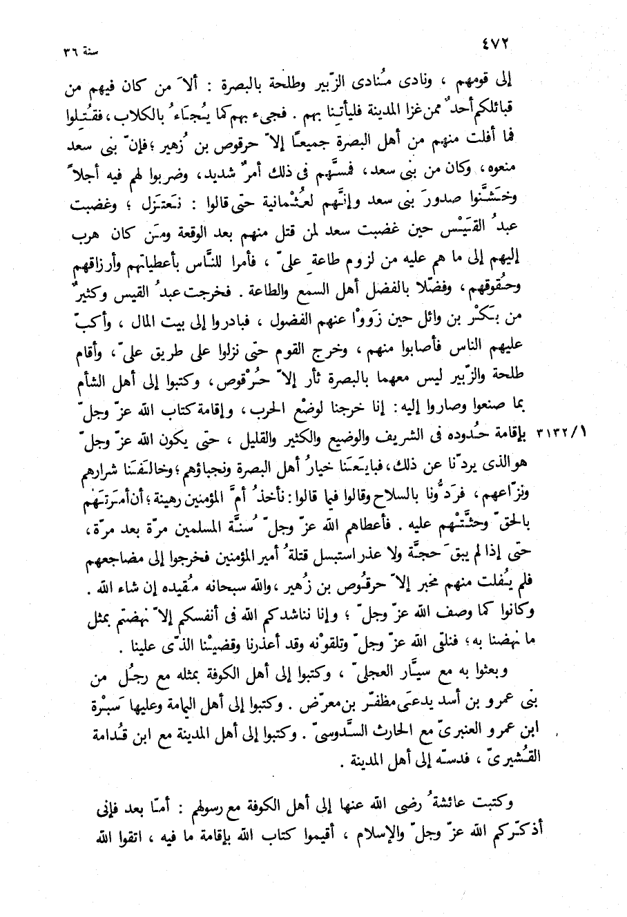 إِلَى قَوْمِهِمْ، وَنَادَى مُنَادِي الزُّبَيْرِ وَطَلْحَةَ بِالْبَصْرَةِ: أَلا مَنْ كَانَ فِيهِمْ مِنْ قَبَائِلِكُمْ أَحَدٌ مِمَّنْ غَزَا الْمَدِينَةَ فَلْيَأْتِنَا بِهِمْ فَجِيءَ بِهِمْ كَمَا يُجَاءُ بِالْكِلابِ، فَقُتِلُوا فَمَا أَفْلَتَ مِنْهُمْ مِنْ أَهْلِ الْبَصْرَةِ جَمِيعًا إِلا حُرْقُوصُ بْنُ زُهَيْرٍ، فَإِنَّ بَنِي سَعْدٍ مَنَعُوهُ، وَكَانَ مِنْ بَنِي سَعْدٍ، فَمَسَّهُمْ فِي ذَلِكَ أَمْرٌ شَدِيدٌ، وَضَرَبُوا لَهُمْ فِيهِ أَجَلا وَخَشَّنُوا صُدُورَ بَنِي سَعْدٍ وَإِنَّهُمْ لَعُثْمَانِيَّةٌ حَتَّى قَالُوا: نَعْتَزِلُ، وَغَضِبَتْ عَبْدُ الْقَيْسِ حِينَ غَضِبَتْ سَعْدٌ لِمَنْ قُتِلَ مِنْهُمْ بَعْدَ الْوَقْعَةِ وَمَنْ كَانَ هَرَبَ إِلَيْهِمْ إِلَى مَا هُمْ عَلَيْهِ مِنْ لُزُومِ طَاعَةِ عَلِيٍّ، فَأَمَرَا لِلنَّاسِ بِأُعْطِيَاتِهِمْ وَأَرْزَاقِهِمْ وَحُقُوقِهِمْ، وَفَضَّلا بِالْفَضْلِ أَهْلَ السَّمْعِ وَالطَّاعَةِ فَخَرَجَتْ عَبْدُ الْقَيْسِ وَكَثِيرٌ مِنْ بَكْرِ بْنِ وَائِلٍ حِينَ زَوَوْا عَنْهُمُ الْفُضُولَ، فَبَادَرُوا إِلَى بَيْتِ الْمَالِ، وَأَكَبَّ عَلَيْهِمُ النَّاسُ فَأَصَابُوا مِنْهُمْ، وَخَرَجَ الْقَوْمُ حَتَّى نَزَلُوا عَلَى طَرِيقِ عَلِيٍّ، وَأَقَامَ طَلْحَةُ وَالزُّبَيْرُ لَيْسَ مَعَهُمَا بِالْبَصْرَةِ ثَأْرٌ إِلا حُرْقُوصٌ، وَكَتَبُوا إِلَى أَهْلِ الشَّامِ بِمَا صَنَعُوا وَصَارُوا إِلَيْهِ: إِنَّا خَرَجْنَا لِوَضْعِ الْحَرْبِ، وَإِقَامَةِ كِتَابِ اللَّهِ عَزَّ وَجَلَّ بِإِقَامَةِ حُدُودِهِ فِي الشَّرِيفِ وَالْوَضِيعِ والكثير وَالْقَلِيلِ، حَتَّى يَكُونَ اللَّهُ عَزَّ وَجَلَّ هُوَ الَّذِي يَرُدُّنَا عَنْ ذَلِكَ، فَبَايَعَنَا خِيَارُ أَهْلِ الْبَصْرَةِ وَنُجَبَاؤُهُمْ، وَخَالَفَنَا شِرَارُهُمْ وَنُزَّاعُهُمْ، فَرَدُّونَا بِالسِّلاحِ وَقَالُوا فِيمَا قَالُوا: نَأْخُذُ أُمَّ الْمُؤْمِنِينَ رَهِينَةً، أَنْ أَمَرَتْهُمْ بِالْحَقِّ وَحَثَّتْهُمْ عَلَيْهِ فَأَعْطَاهُمُ اللَّهُ عَزَّ وَجَلَّ سُنَّةَ الْمُسْلِمِينَ مَرَّةً بَعْدَ مَرَّةٍ، حَتَّى إِذَا لَمْ يَبْقَ حُجَّةٌ وَلا عُذْرٌ اسْتَبْسَلَ قَتَلَةُ أَمِيرِ الْمُؤْمِنِينَ فَخَرَجُوا إِلَى مَضَاجِعِهِمْ فَلَمْ يُفْلِتْ مِنْهُمْ مُخْبَرٌ إِلا حُرْقُوصُ بْنُ زُهَيْرٍ، وَاللَّهُ سُبْحَانَهُ مُقِيدُهُ إِنْ شَاءَ اللَّهُ.