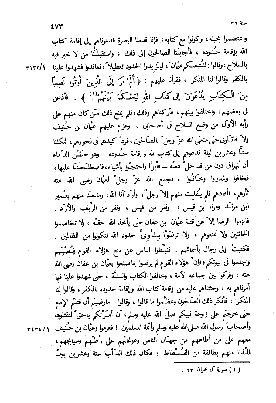 وَاعْتَصِمُوا بِحَبْلِهِ، وَكُونُوا مَعَ كِتَابِهِ، فَإِنَّا قَدِمْنَا الْبَصْرَةَ فَدَعَوْنَاهُمْ إِلَى إِقَامَةِ كِتَابِ اللَّهِ بِإِقَامَةِ حُدُودِهِ، فَأَجَابَنَا الصَّالِحُونَ إِلَى ذَلِكَ، وَاسْتَقْبَلَنَا مَنْ لا خَيْرَ فِيهِ بِالسِّلاحِ، وَقَالُوا: لَنُتْبِعَنَّكُمْ عُثْمَانَ، ليزيدوا الْحُدُودَ تَعْطِيلا، فَعَانَدُوا فَشَهِدُوا عَلَيْنَا بِالْكُفْرِ وَقَالُوا لَنَا الْمُنْكَرَ، فَقَرَأْنَا عَلَيْهِمْ: «أَلَمْ تَرَ إِلَى الَّذِينَ أُوتُوا نَصِيباً مِنَ الْكِتابِ يُدْعَوْنَ إِلى كِتابِ اللَّهِ لِيَحْكُمَ بَيْنَهُمْ» فَأَذْعَنَ لِي بَعْضُهُمْ، وَاخْتَلَفُوا بَيْنَهُمْ، فَتَرَكْنَاهُمْ وَذَلِكَ، فَلَمْ يَمْنَعْ ذَلِكَ مَنْ كَانَ مِنْهُمْ عَلَى رَأْيِهِ الأَوَّلِ مِنْ وَضْعِ السِّلاحِ فِي أَصْحَابِي، وَعَزَمَ عَلَيْهِمْ عُثْمَانُ بْنُ حُنَيْفٍ إِلا قَاتَلُونِي حَتَّى مَنَعَنِي اللَّهُ عَزَّ وَجَلَّ بِالصَّالِحِينَ، فَرَدَّ كَيْدَهُمْ فِي نُحُورِهِمْ، فَمَكَثْنَا سِتًّا وَعِشْرِينَ لَيْلَةً نَدْعُوهُمْ إِلَى كِتَابِ اللَّهِ وَإِقَامَةِ حُدُودِهِ- وَهُوَ حَقْنُ الدِّمَاءِ أَنْ تُهْرَاقَ دُونَ مَنْ قَدْ حَلَّ دَمُهُ- فَأَبَوْا وَاحْتَجُّوا بِأَشْيَاءَ، فَاصْطَلَحْنَا عَلَيْهَا، فخافوا وغدروا وخانوا، فَجَمَعَ اللَّهُ عَزَّ وَجَلَّ لِعُثْمَانَ رَضِيَ اللَّهُ عَنْهُ ثَأْرَهُمْ، فَأَقَادَهُمْ فَلَمْ يُفْلِتْ مِنْهُمْ إِلا رجل، وارد انا الله، ومنعنا منهم بعمير ابن مَرْثَدٍ وَمَرْثَدِ بْنِ قَيْسٍ، وَنَفَرٍ مِنْ قَيْسٍ، وَنَفَرٍ مِنَ الرَّبَابِ وَالأَزْدِ.