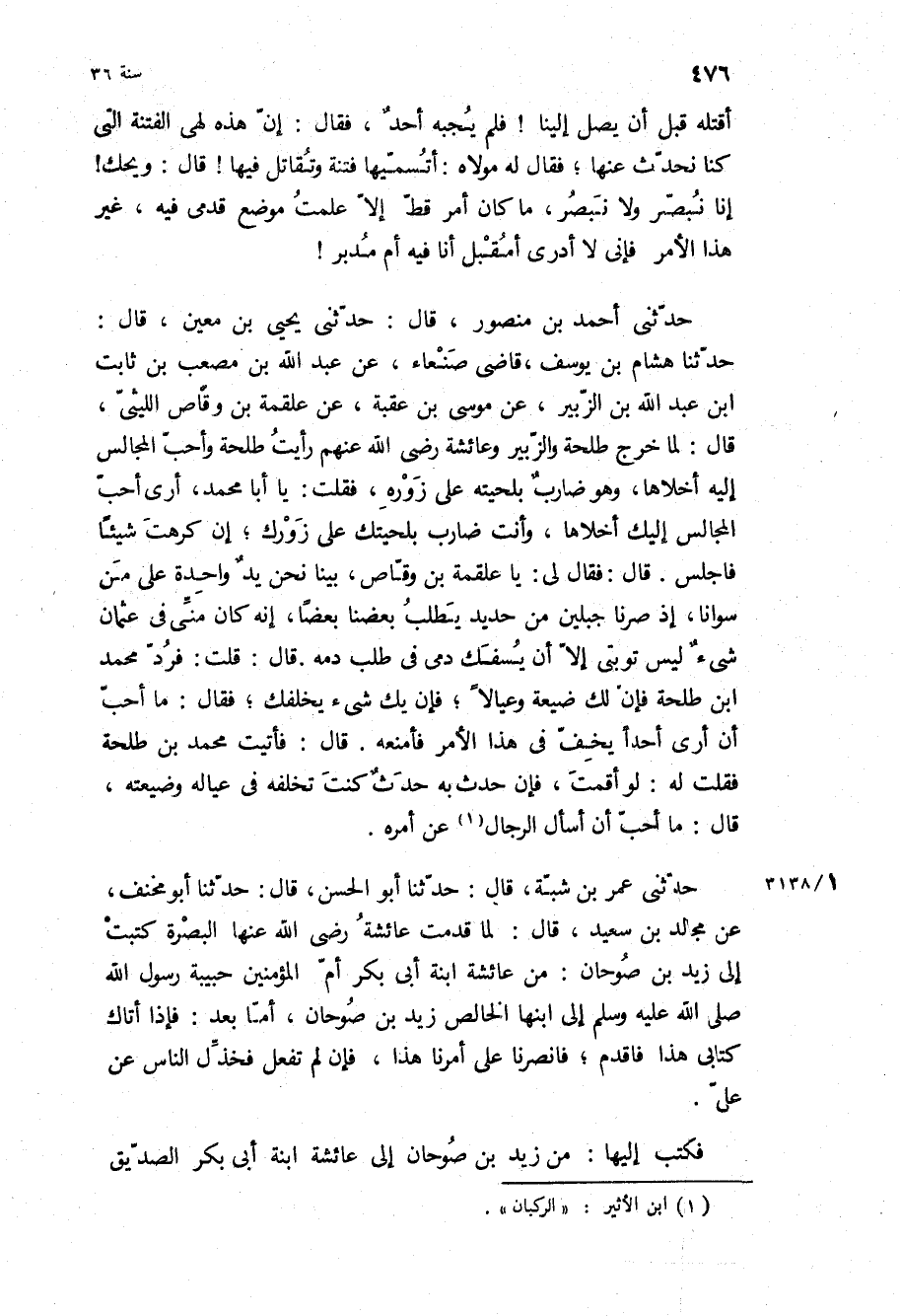حدثنا هشام بن يوسف، قاضي صنعاء، عن عبد الله بن مصعب بن ثابت ابن عَبْدِ اللَّهِ بْنِ الزُّبَيْرِ، عَنْ مُوسَى بْنِ عقبة، عن علقمة بن وقاص الليثي، قال: لما خرج طلحة والزبير وعائشة رضي الله عَنْهُمْ رَأَيْتُ طَلْحَةَ وَأَحَبُّ الْمَجَالِسِ إِلَيْهِ أَخْلاهَا، وَهُوَ ضَارِبٌ بِلِحْيَتِهِ عَلَى زَوْرِهِ، فَقُلْتُ: يَا أَبَا مُحَمَّدٍ، أَرَى أَحَبَّ الْمَجَالِسِ إِلَيْكَ أَخْلاهَا، وَأَنْتَ ضَارِبٌ بِلِحْيَتِكَ عَلَى زَوْرِكَ، إِنْ كَرِهْتَ شَيْئًا فَاجْلِسْ قَالَ: فَقَالَ لِي: يَا عَلْقَمَةُ بْنَ وَقَّاصٍ، بَيْنَا نَحْنُ يَدٌ وَاحِدَةٌ عَلَى مَنْ سِوَانَا، إِذْ صِرْنَا جَبَلَيْنِ مِنْ حَدِيدٍ يَطْلُبُ بَعْضُنَا بَعْضًا، إِنَّهُ كَانَ مِنِّي فِي عُثْمَانَ شَيْءٌ لَيْسَ تَوْبَتِي إِلا أَنْ يُسْفَكَ دَمِي فِي طَلَبِ دَمِهِ قَالَ: قُلْتُ: فَرَدَّ محمد ابن طَلْحَةَ فَإِنَّ لَكَ ضَيْعَةً وَعِيَالا، فَإِنْ يَكُ شَيْءٌ يُخْلِفُكَ، فَقَالَ: مَا أُحِبُّ أَنْ أَرَى أَحَدًا يَخِفُّ فِي هَذَا الأَمْرِ فَأَمْنَعُهُ قَالَ: فَأَتَيْتُ مُحَمَّدَ بْنَ طَلْحَةَ فَقُلْتُ لَهُ: لَوْ أَقَمْتَ، فَإِنْ حَدَثَ بِهِ حَدَثٌ كُنْتَ تَخْلُفُهُ فِي عِيَالِهِ وَضَيْعَتِهِ، قَالَ: مَا أُحِبُّ أَنْ أَسْأَلَ الرِّجَالَ عَنْ أَمْرِهِ.