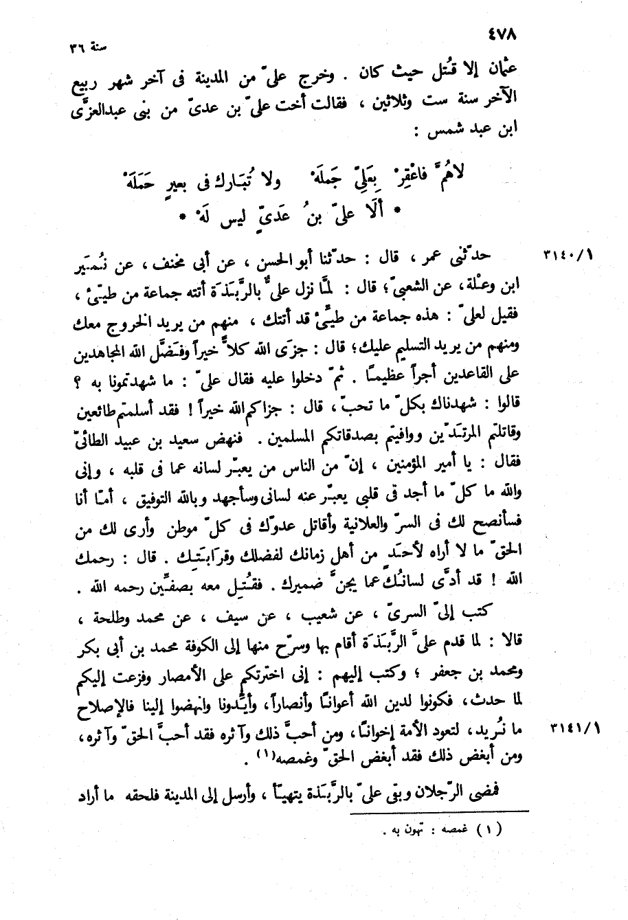 حدثني عمر، قال: حدثنا أبو الحسن، عن ابى مخنف، عن نمير ابن وَعْلَةَ، عَنِ الشَّعْبِيِّ، قَالَ: لَمَّا نَزَلَ عَلِيٌّ بالربذة اتته جماعه من طيّئ، فقيل لعلى: هذه جماعه من طيّئ قَدْ أَتَتْكَ، مِنْهُمْ مَنْ يُرِيدُ الْخُرُوجَ مَعَكَ وَمِنْهُمْ مَنْ يُرِيدُ التَّسْلِيمَ عَلَيْكَ، قَالَ: جَزَى اللَّهُ كُلا خَيْرًا وفَضَّلَ اللَّهُ الْمُجاهِدِينَ عَلَى الْقاعِدِينَ أَجْراً عَظِيماً ثُمَّ دَخَلُوا عَلَيْهِ [فَقَالَ عَلِيٌّ: مَا شَهِدْتُمُونَا بِهِ؟