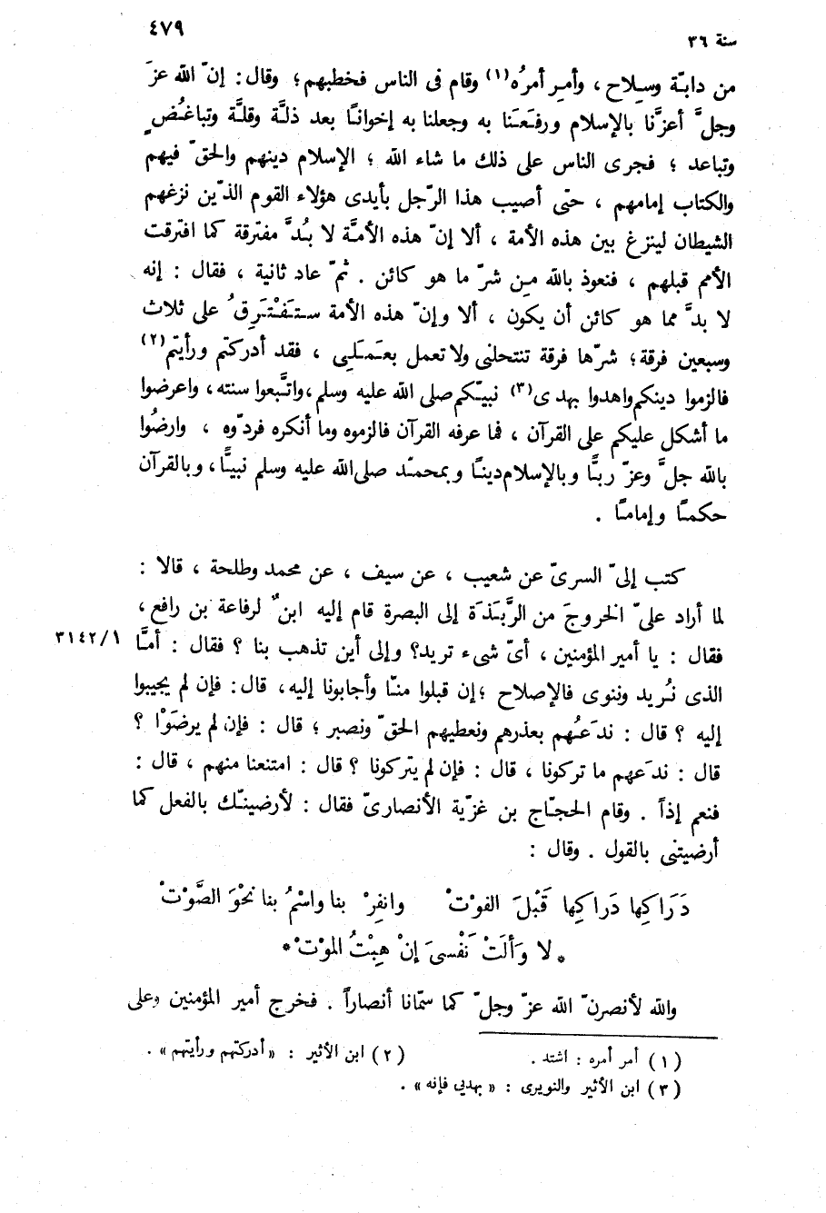 مِنْ دَابَّةٍ وَسِلاحٍ، وأمر أَمْرَهُ وَقَامَ فِي النَّاسِ فَخَطَبَهُمْ، وَقَالَ: إِنَّ اللَّهَ عَزَّ وَجَلَّ أَعَزَّنَا بِالإِسْلامِ وَرَفَعَنَا بِهِ وَجَعَلَنَا بِهِ إِخْوَانًا بَعْدَ ذِلَّةٍ وَقِلَّةٍ وَتَبَاغُضٍ وَتَبَاعُدٍ، فَجَرَى النَّاسُ عَلَى ذَلِكَ مَا شَاءَ اللَّهُ، الإِسْلامُ دِينُهُمْ وَالْحَقُّ فِيهِمْ وَالْكِتَابُ إِمَامُهُمْ، حَتَّى أُصِيبَ هَذَا الرَّجُلُ بِأَيْدِي هَؤُلاءِ الْقَوْمِ الَّذِينَ نَزَغَهُمُ الشَّيْطَانُ لِيَنْزَغَ بَيْنَ هَذِهِ الأُمَّةِ، أَلا إِنَّ هَذِهِ الأُمَّةَ لا بُدَّ مُفْتَرِقَةٌ كَمَا افْتَرَقَتِ الأُمَمُّ قَبْلَهُمْ، فَنَعُوذُ بِاللَّهِ مِنْ شَرِّ مَا هُوَ كَائِنٌ ثُمَّ عَادَ ثَانِيَةً، فَقَالَ: إِنَّهُ لا بُدَّ مِمَّا هُوَ كَائِنٌ أَنْ يَكُونَ، أَلا وَإِنَّ هَذِهِ الأُمَّةَ سَتَفْتَرِقُ عَلَى ثَلاثٍ وَسَبْعِينَ فِرْقَةً، شَرُّهَا فِرْقَةٌ تَنْتَحِلُنِي وَلا تَعْمَلُ بِعَمَلِي، فَقَدْ أَدْرَكْتُمْ وَرَأَيْتُمْ فَالْزَمُوا دِينَكُمْ وَاهْدُوا بِهَدْيِ نبيكم ص، وَاتَّبِعُوا سُنَّتَهُ، وَاعْرِضُوا مَا أُشْكِلَ عَلَيْكُمْ عَلَى الْقُرْآنِ، فَمَا عَرَّفَهُ الْقُرْآنُ فَالْزَمُوهُ وَمَا أَنْكَرَهُ فَرُدُّوهُ، وَارْضَوْا بِاللَّهِ جَلَّ وَعَزَّ رَبًّا وَبِالإِسْلامِ دينا وبمحمد ص نَبِيًّا، وَبِالْقُرْآنِ حَكَمًا وَإِمَامًا.