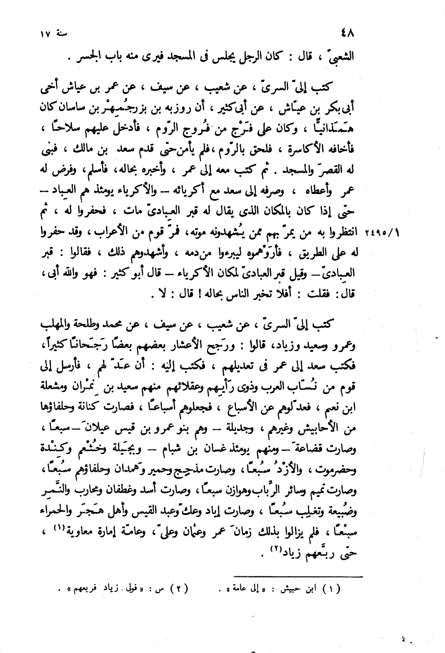الشعبي، قال: كان الرجل يجلس في المسجد فيرى منه باب الجسر كَتَبَ إِلَيَّ السَّرِيُّ، عَنْ شُعَيْبٍ، عَنْ سَيْفٍ، عن عمر بْن عياش أخي أبي بكر بْن عياش، عن أبي كثير، أن روزبه بْن بزرجمهر بْن ساسان كان همذانيا، وكان على فرج من فروج الروم، فأدخل عليهم سلاحا، فأخافه الأكاسرة، فلحق بالروم، فلم يأمن حتى قدم سعد بْن مالك، فبنى له القصر والمسجد ثم كتب معه إلى عمر، وأخبره بحاله، فأسلم، وفرض له عمر وأعطاه، وصرفه إلى سعد مع أكريائه- والأكرياء يومئذ هم العباد- حتى إذا كان بالمكان الذي يقال له قبر العبادي مات، فحفروا له، ثم انتظروا به من يمر بهم ممن يشهدونه موته، فمر قوم من الأعراب، وقد حفروا له على الطريق، فأروهموه ليبرءوا من دمه، وأشهدوهم ذلك، فقالوا: قبر العبادي- وقيل قبر العبادي لمكان الأكرياء- قال أبو كثير: فهو والله أبي، قال: فقلت: أفلا تخبر الناس بحاله! قال: لا كَتَبَ إِلَيَّ السَّرِيُّ، عَنْ شُعَيْبٍ، عَنْ سيف، عن محمد وطلحة والمهلب وعمرو وسعيد وزياد، قالوا: ورجح الأعشار بعضهم بعضا رجحانا كثيرا، فكتب سعد الى عمر في تعديلهم، فكتب اليه: ان عد لهم، فأرسل إلى قوم من نساب العرب وذوي رأيهم وعقلائهم منهم سعيد بن نمران ومشعله ابن نعيم، فعدلوهم عن الأسباع، فجعلوهم أسباعا، فصارت كنانة وحلفاؤها من الأحابيش وغيرهم، وجديلة- وهم بنو عمرو بْن قيس عيلان- سبعا، وصارت قضاعة- ومنهم يومئذ غسان بْن شبام- وبجيلة وخثعم وكندة وحضرموت، والأزد سبعا، وصارت مذحج وحمير وهمدان وحلفاؤهم سبعا، وصارت تميم وسائر الرباب وهوازن سبعا، وصارت أسد وغطفان ومحارب والنمر وضبيعة وتغلب سبعا، وصارت إياد وعك وعبد القيس وأهل هجر والحمراء سبعا، فلم يزالوا بذلك زمان عمر وعثمان وعلي، وعامة إمارة معاوية، حتى ربعهم زياد