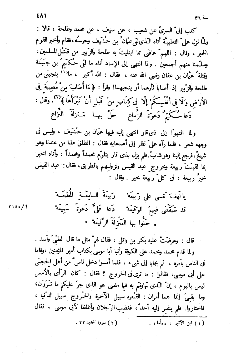 وَلَمَّا نَزَلَ عَلِيٌّ الثَّعْلَبِيَّةَ أَتَاهُ الَّذِي لَقِيَ عُثْمَانَ بْنَ حُنَيْفٍ وَحَرَسَهُ، فَقَامَ وَأَخْبَرَ الْقَوْمَ الْخَبَرَ، وَقَالَ: اللَّهُمَّ عَافِنِي مِمَّا ابْتَلَيْتَ بِهِ طَلْحَةَ وَالزُّبَيْرَ مِنْ قَتْلِ الْمُسْلِمِينَ، وَسَلِّمْنَا مِنْهُمْ أَجْمَعِينَ وَلَمَّا انْتَهَى إِلَى الإِسَادِ أَتَاهُ مَا لَقِيَ حَكِيمُ بْنُ جَبَلَةَ وَقَتَلَةُ عُثْمَانَ بْنِ عَفَّانَ رَضِيَ اللَّهُ عَنْهُ، [فَقَالَ: اللَّهُ أَكْبَرُ، مَا يُنْجِينِي مِنْ طلحه والزبير إذ أصابا ثَأْرَهُمَا أَوْ يُنْجِيهِمَا! وَقَرَأَ: «مَا أَصابَ مِنْ مُصِيبَةٍ فِي الْأَرْضِ وَلا فِي أَنْفُسِكُمْ إِلَّا فِي كِتابٍ مِنْ قَبْلِ أَنْ نَبْرَأَها» وَقَالَ: