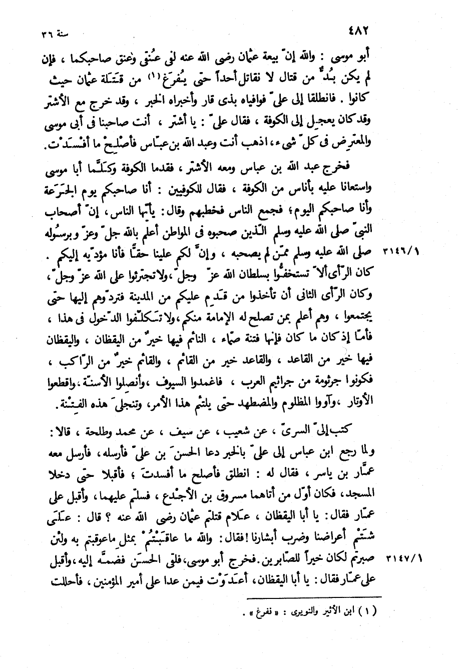 وَلَمَّا رَجَعَ ابْنُ عَبَّاسٍ إِلَى عَلِيٍّ بِالْخَبَرِ دَعَا الْحَسَنَ بْنَ عَلِيٍّ فَأَرْسَلَهُ، فَأَرْسَلَ مَعَهُ عَمَّارَ بْنَ يَاسِرٍ، فَقَالَ لَهُ: انْطَلِقْ فَأَصْلِحْ مَا أَفْسَدْتَ، فَأَقْبَلا حَتَّى دَخَلا الْمَسْجِدَ، فَكَانَ أَوَّلَ مَنْ أَتَاهُمَا مَسْرُوقُ بْنُ الأَجْدَعِ، فَسَلَّمَ عَلَيْهِمَا، وَأَقْبَلَ عَلَى عَمَّارٍ فَقَالَ: يَا أَبَا الْيَقْظَانِ، عَلامَ قَتَلْتُمْ عُثْمَانَ رَضِيَ اللَّهُ عَنْهُ؟ قَالَ: عَلَى شَتْمِ أَعْرَاضِنَا وَضَرْبِ أَبْشَارِنَا! فَقَالَ: وَاللَّهِ مَا عَاقَبْتُمْ بِمِثْلِ مَا عُوقِبْتُمْ بِهِ وَلَئِنْ صَبَرْتُمْ لَكَانَ خَيْرًا لِلصَّابِرِينَ فَخَرَجَ أَبُو مُوسَى، فَلَقِيَ الْحَسَنَ فَضَمَّهُ إِلَيْهِ، وَأَقْبَلَ عَلَى عَمَّارٍ فَقَالَ: يَا أَبَا الْيَقْظَانِ، أَعَدَوْتَ فِيمَنْ عَدَا عَلَى أَمِيرِ الْمُؤْمِنِينَ، فَأَحْلَلْتَ