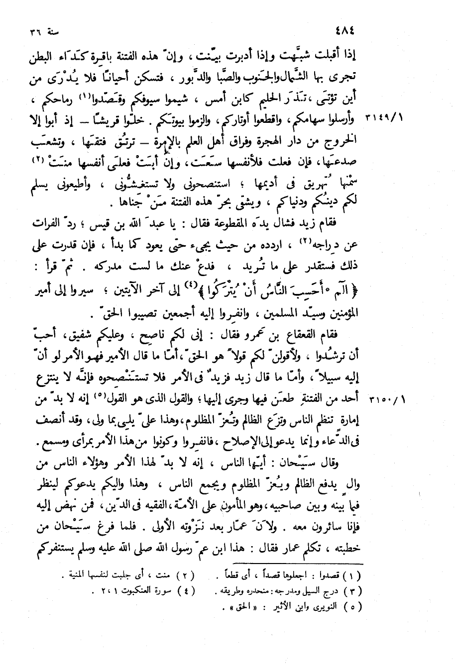 إِذَا أَقْبَلَتْ شَبَّهَتْ وَإِذَا أَدْبَرَتْ بَيَّنَتْ، وَإِنَّ هَذِهِ الْفِتْنَةَ بَاقِرَةٌ كَدَاءِ الْبَطْنِ تَجْرِي بِهَا الشَّمَالُ وَالْجَنُوبُ وَالصَّبَا وَالدَّبُورُ، فَتَسْكُنُ أَحْيَانًا فَلا يُدْرَى مِنْ أَيْنَ تُؤْتَى، تَذَرُ الْحَلِيمَ كَابْنِ أَمْسِ، شَيِّمُوا سُيُوفَكُمْ وَقَصِّدُوا رِمَاحَكُمْ، وَأَرْسِلُوا سِهَامَكُمْ، واقطعوا أوتاركم، والزموا بيوتكم خلوا قريشا- إذ أَبَوْا إِلا الْخُرُوجَ مِنْ دَارِ الْهِجْرَةِ وَفِرَاقِ أَهْلِ الْعِلْمِ بِالإِمْرَةِ- تَرْتِقُ فَتْقَهَا، وَتُشْعِبُ صَدْعَهَا، فَإِنْ فَعَلَتْ فَلأَنْفُسِهَا سَعَتْ، وَإِنْ أَبَتْ فَعَلَى أَنْفُسِهَا مَنَّتْ سَمْنَهَا تُهْرِيقُ فِي أَدِيمِهَا، اسْتَنْصِحُونِي وَلا تَسْتَغِشُّونِي، وَأَطِيعُونِي يَسْلَمْ لَكُمْ دِينُكُمْ وَدُنْيَاكُمْ، وَيَشْقَى بحر هَذِهِ الْفِتْنَةِ مَنْ جَنَاهَا.