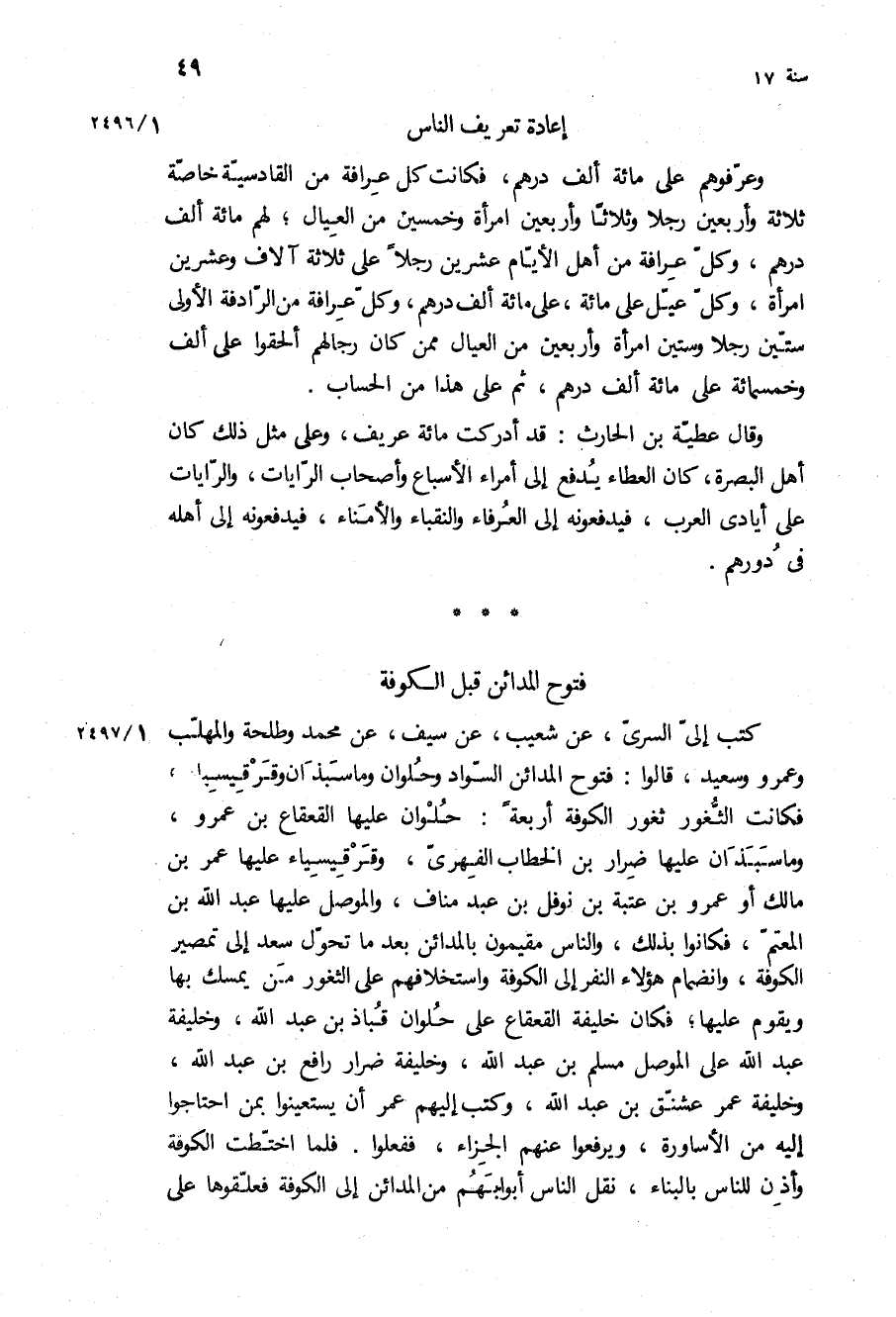وعرفوهم على مائة ألف درهم، فكانت كل عرافة من القادسية خاصة ثلاثة وأربعين رجلا وثلاثا وأربعين امرأة وخمسين من العيال، لهم مائة ألف درهم، وكل عرافة من أهل الأيام عشرين رجلا على ثلاثة آلاف وعشرين امرأة، وكل عيل على مائة، على مائة ألف درهم، وكل عرافة من الرادفة الأولى ستين رجلا وستين امرأة وأربعين من العيال ممن كان رجالهم ألحقوا على الف وخمسمائة على مائه الف درهم، ثم على هذا من الحساب.