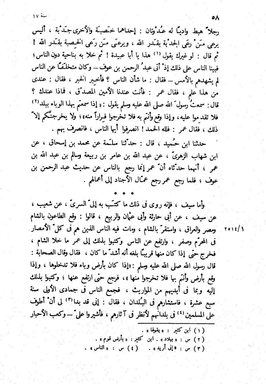 [قال رسول الله ص: إِذَا كَانَ بِأَرْضٍ وَبَاءٌ فَلا تَدْخُلُوهَا، وَإِذَا وَقَعَ بِأَرْضٍ وَأَنْتُمْ بِهَا فَلا تَخْرُجُوا مِنْهَا،] فَرَجَعَ حَتَّى ارْتَفَعَ عَنْهَا، وَكَتَبُوا بِذَلِكَ إِلَيْهِ وَبِمَا فِي أَيْدِيهِمْ مِنَ الْمَوَارِيثِ، فَجَمَعَ النَّاسَ فِي جُمَادَى الأُولَى سَنَةَ سَبْعَ عَشْرَةَ، فَاسْتَشَارَهُمْ فِي الْبُلْدَانِ، فَقَالَ: إِنِّي قَدْ بَدَا لِي أَنْ أَطُوفَ عَلَى الْمُسْلِمِينَ فِي بِلْدَانِهِمْ لأَنْظُرَ فِي آثَارِهِمْ، فَأَشِيرُوا عَلَيَّ- وَكَعْبُ الأَحْبَارِ