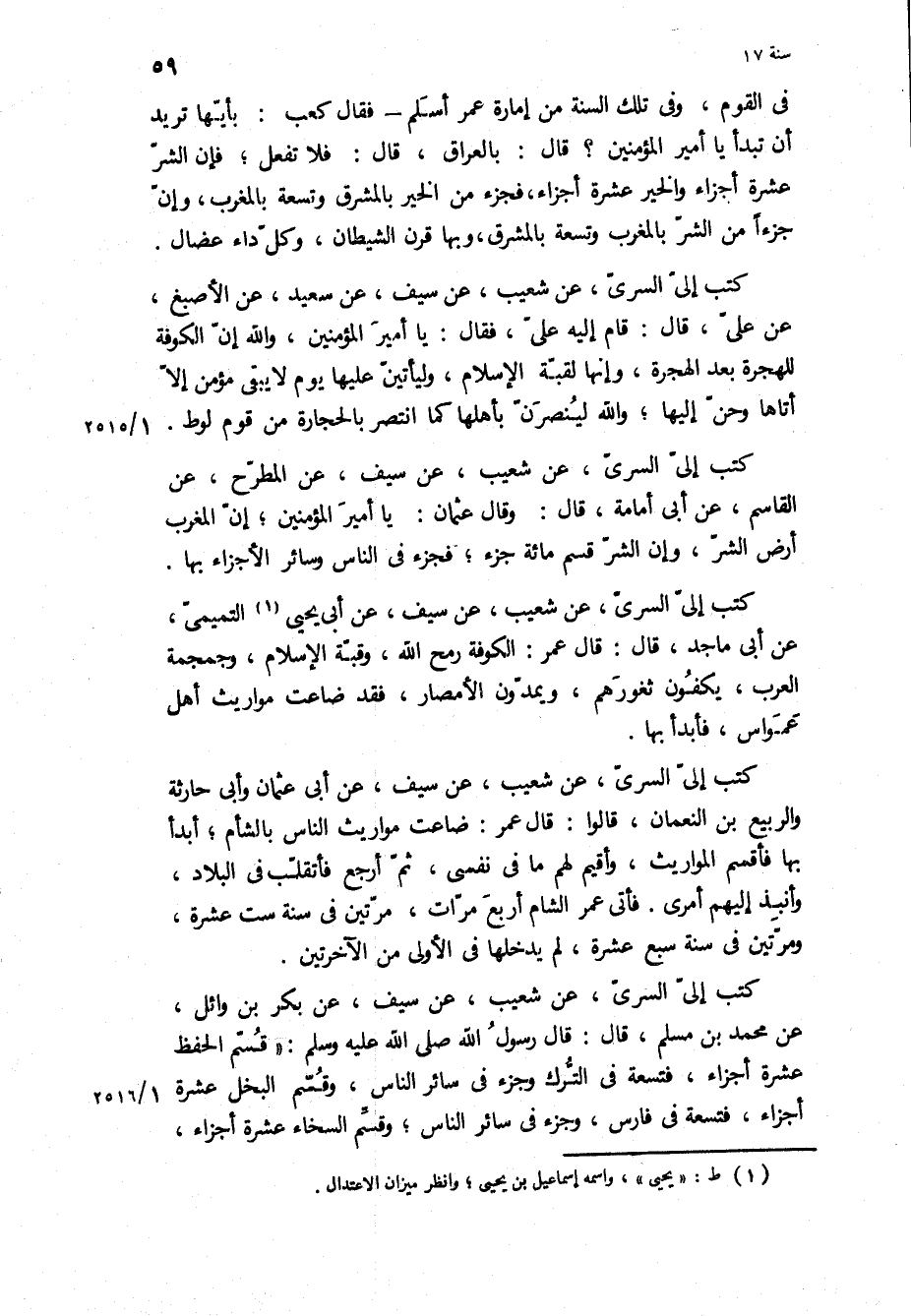 كَتَبَ إِلَيَّ السري، عن شعيب، عن سيف، عن أبي عُثْمَانَ وَأَبِي حَارِثَةَ وَالرَّبِيعِ بْنِ النُّعْمَانِ، قَالُوا: قَالَ عُمَرُ: ضَاعَتْ مَوَارِيثُ النَّاسِ بِالشَّامِ، أَبْدَأُ بِهَا فَأُقَسِّمُ الْمَوَارِيثَ، وَأُقِيمُ لَهُمْ مَا فِي نَفْسِي، ثُمَّ أَرْجِعُ فَأَتَقَلَّبُ فِي الْبِلادِ، وَأَنْبِذُ إِلَيْهِمْ أَمْرِي فَأَتَى عُمَرُ الشَّامَ أَرْبَعَ مَرَّاتٍ، مَرَّتَيْنِ فِي سَنَةِ سِتَّ عَشْرَةَ، وَمَرَّتَيْنِ فِي سَنَةِ سَبْعَ عَشْرَةَ، لَمْ يَدْخُلْهَا فِي الأُولَى مِنَ الآخِرَتَيْنِ.
