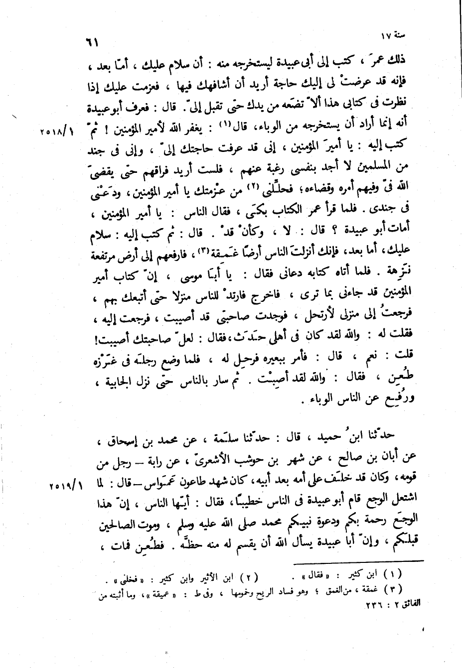 حَدَّثَنَا ابن حميد، قال: حَدَّثَنَا سلمة، عن محمد بن إسحاق، عن أبان بن صالح، عَنْ شَهْرِ بْنِ حَوْشَبٍ الأَشْعَرِيِّ، عَنْ رَابةَ- رَجُلٌ مِنْ قَوْمِهِ، وَكَانَ قَدْ خَلَفَ عَلَى أُمِّهِ بَعْدَ أَبِيهِ، كَانَ شَهِدَ طَاعُونَ عِمْوَاسَ- قَالَ: لَمَّا اشْتَعَلَ الْوَجَعُ قَامَ أَبُو عُبَيْدَةَ فِي النَّاسِ خَطِيبًا، فَقَالَ: أَيُّهَا النَّاسُ، إِنَّ هذا الوجع رحمه بكم ودعوه نبيكم محمد ص، وَمَوْتُ الصَّالِحِينَ قَبْلَكُمْ، وَإِنَّ أَبَا عُبَيْدَةَ يَسْأَلُ اللَّهَ أَنْ يَقْسِمَ لَهُ مِنْهُ حَظَّهُ فَطُعِنَ فمات،