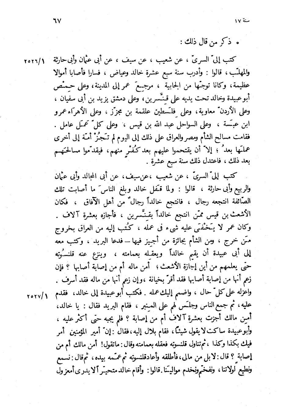 كَتَبَ إِلَيَّ السَّرِيُّ، عن شعيب، عن سيف، عن أبي عثمان وأبي حارثة والمهلب، قالوا: وأدرب سنة سبع عشرة خالد وعياض، فسارا فأصابا أموالا عظيمة، وكانا توجها من الجابية، مرجع عمر إلى المدينة، وعلى حمص أبو عبيدة وخالد تحت يديه على قنسرين، وعلى دمشق يزيد بْن أبي سفيان، وعلى الأردن معاوية، وعلى فلسطين علقمة بْن مجزز، وعلى الأهراء عمرو ابن عبسة، وعلى السواحل عبد اللَّه بْن قيس، وعلى كل عمل عامل.