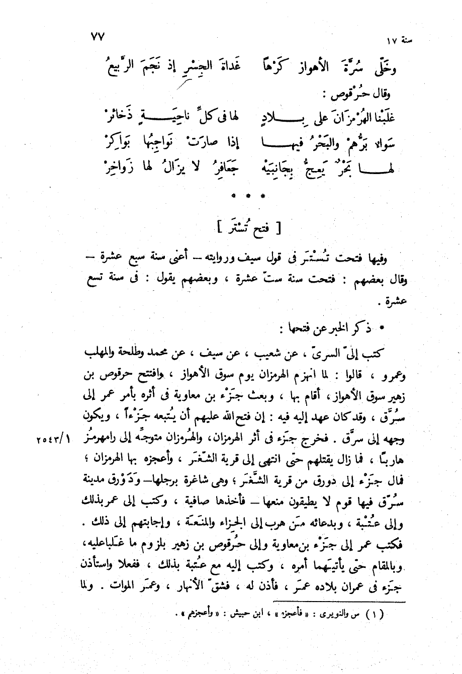 وفيها فتحت تستر في قول سيف وروايته- أعني سنة سبع عشرة- وقال بعضهم: فتحت سنة ست عشرة، وبعضهم يقول: في سنة تسع عشرة.