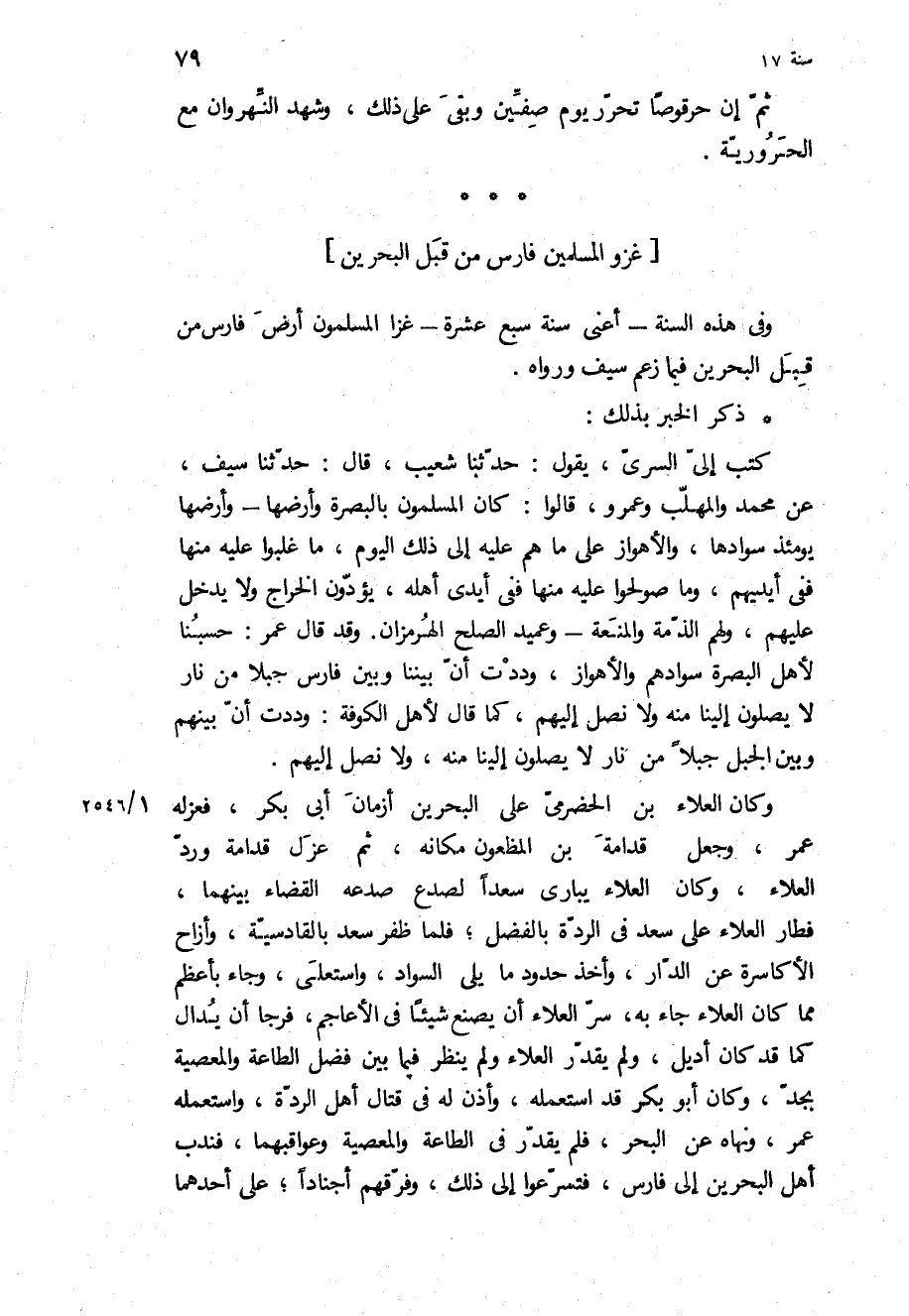وفي هذه السنة- أعني سنة سبع عشرة- غزا المسلمون أرض فارس من قبل البحرين فيما زعم سيف ورواه.