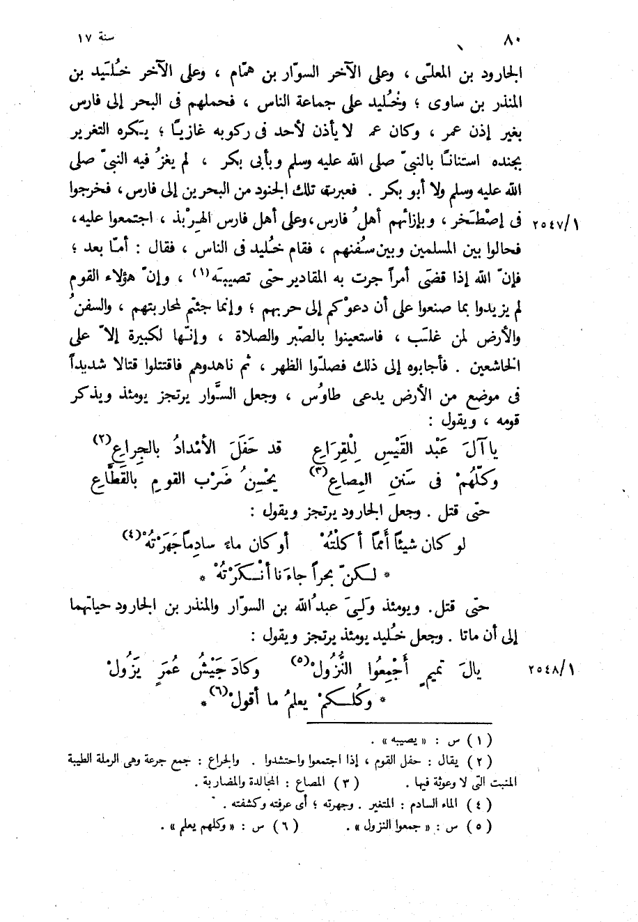 الجارود بْن المعلى، وعلى الآخر السوار بْن همام، وعلى الآخر خليد بْن المنذر بْن ساوى، وخليد على جماعة الناس، فحملهم في البحر إلى فارس بغير إذن عمر، وكان عمر لا يأذن لأحد في ركوبه غازيا، يكره التغرير بجنده استنانا بالنبي ص وبابى بكر، لم يغز فيه النبي ص ولا أبو بكر فعبرت تلك الجنود من البحرين إلى فارس، فخرجوا في إصطخر، وبإزائهم أهل فارس، وعلى أهل فارس الهربذ، اجتمعوا عليه، فحالوا بين المسلمين وبين سفنهم، فقام خليد في الناس، فقال: أما بعد، فإن اللَّه إذا قضى أمرا جرت به المقادير حتى تصيبه، وإن هؤلاء القوم لم يزيدوا بما صنعوا على أن دعوكم إلى حربهم، وإنما جئتم لمحاربتهم، والسفن والأرض لمن غلب، ف اسْتَعِينُوا بِالصَّبْرِ وَالصَّلاةِ، وَإِنَّها لَكَبِيرَةٌ إِلَّا عَلَى الْخاشِعِينَ فأجابوه إلى ذلك فصلوا الظهر، ثم ناهدوهم فاقتتلوا قتالا شديدا في موضع من الأرض يدعى طاوس، وجعل السوار يرتجز يومئذ ويذكر قومه، ويقول: